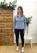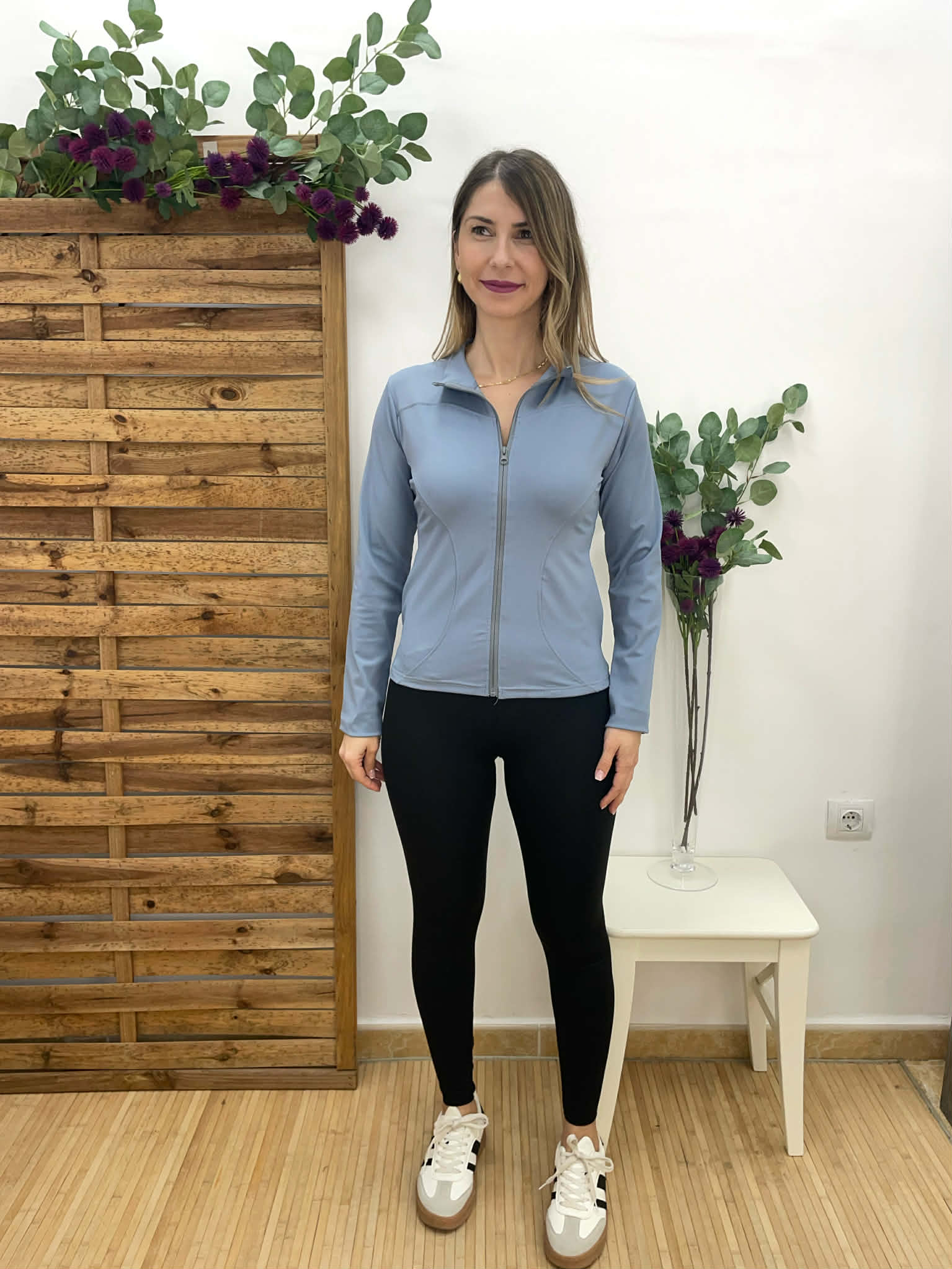 Conjunto de licra deportivo con chaqueta en color celeste, bolsillos en ambos laterales y abertura en manga para el pulgar. Legging negro con cinta push up y cintura alta reforzada.