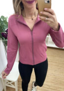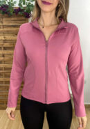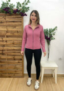 Conjunto de licra deportivo con chaqueta en color rosa, bolsillos en ambos laterales y abertura en manga para el pulgar. Legging negro con cinta push up y cintura alta reforzada.