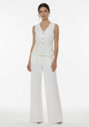 Conjunto blanco de chaleco con guipur y botones dorados. Pantalón recto con bolsillos y goma.