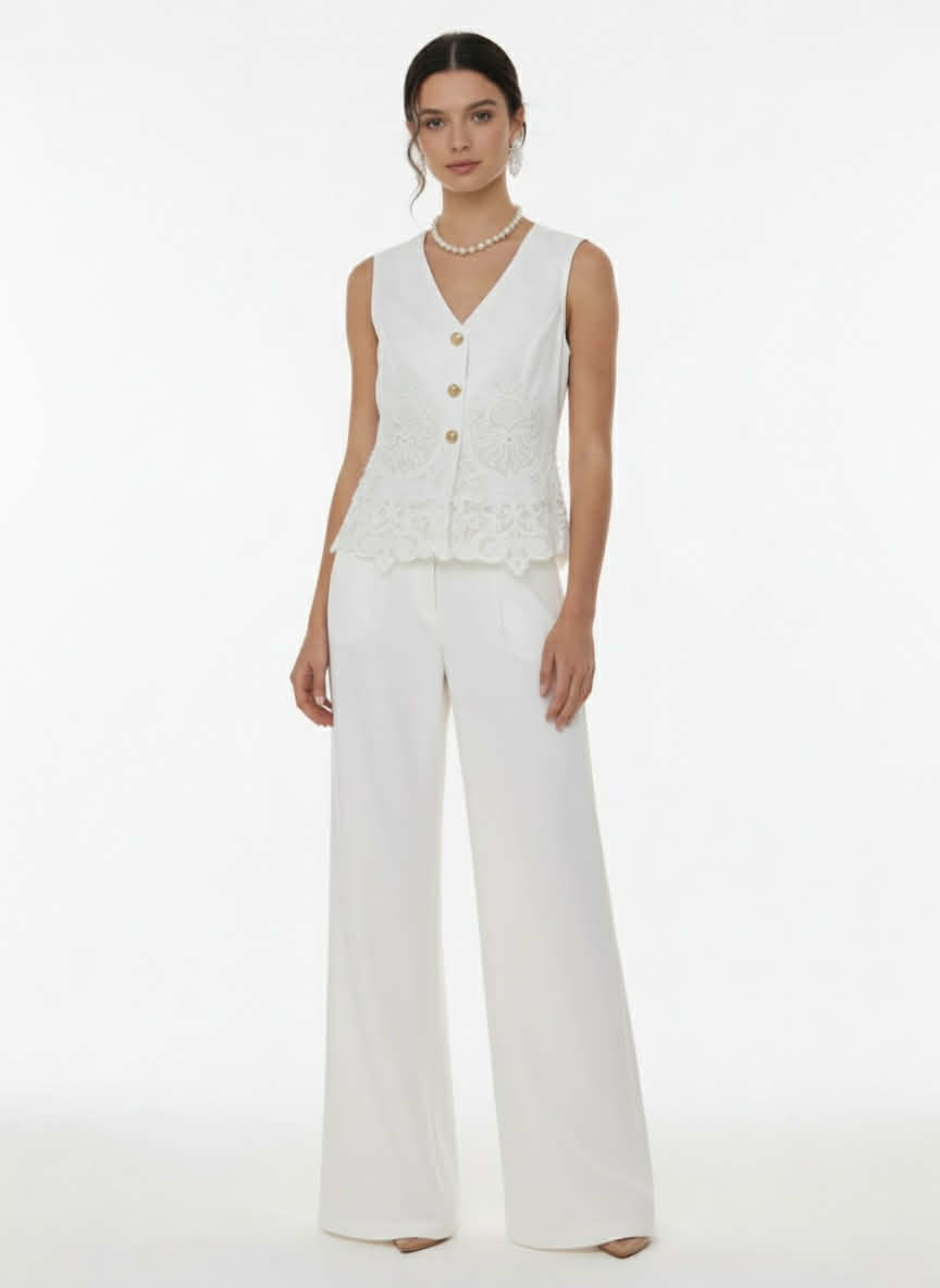 Conjunto blanco de chaleco con guipur y botones dorados. Pantalón recto con bolsillos y goma.