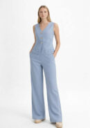 Conjunto celeste de chaleco con guipur y botones dorados. Pantalón recto con bolsillos y goma.