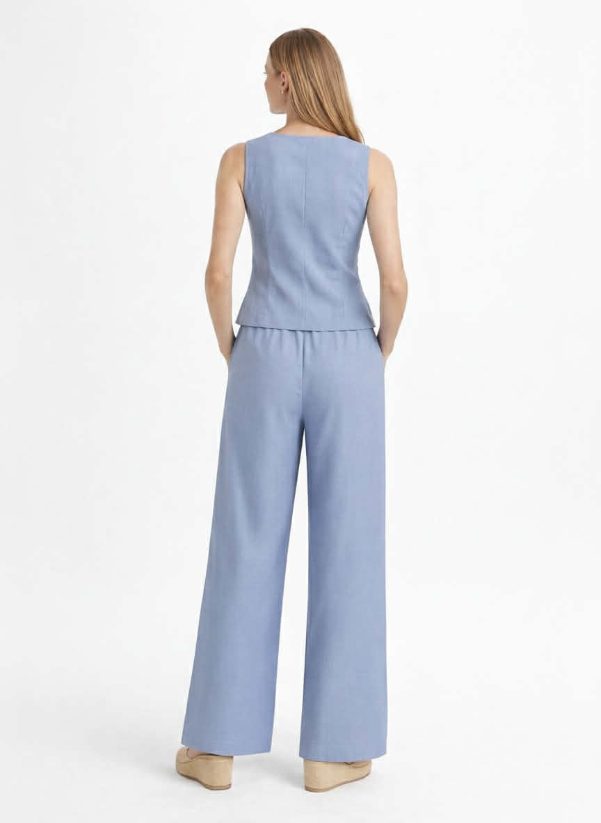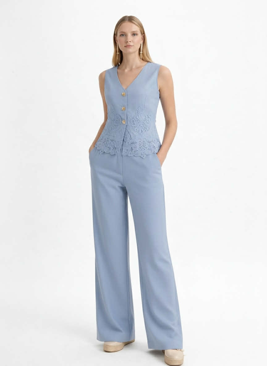 Conjunto celeste de chaleco con guipur y botones dorados. Pantalón recto con bolsillos y goma.