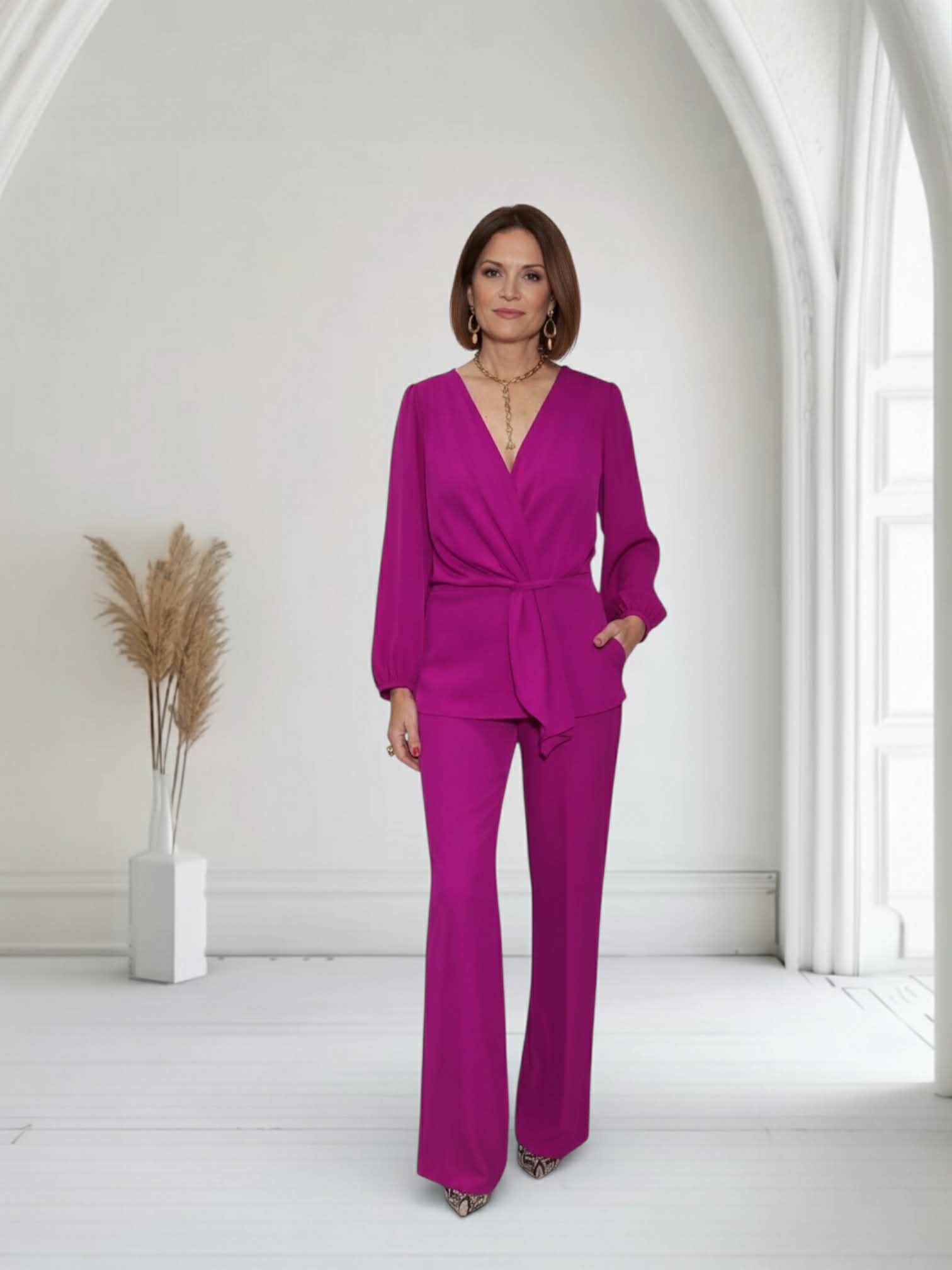 Conjunto buganvilla de blusa con lazada y pantalón de tejido fluido con goma en la cintura.