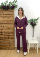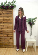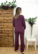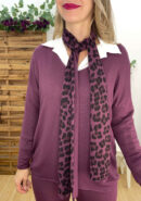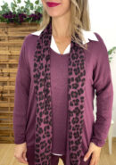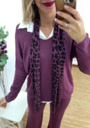 Conjunto de punto suave en color berenjena de suéter oversize con escote en pico y pantalón recto con goma en la cintura. Incluye pañuelo en color berenjena con estampado leopardo.