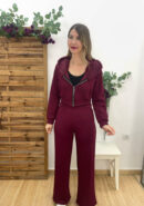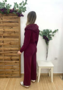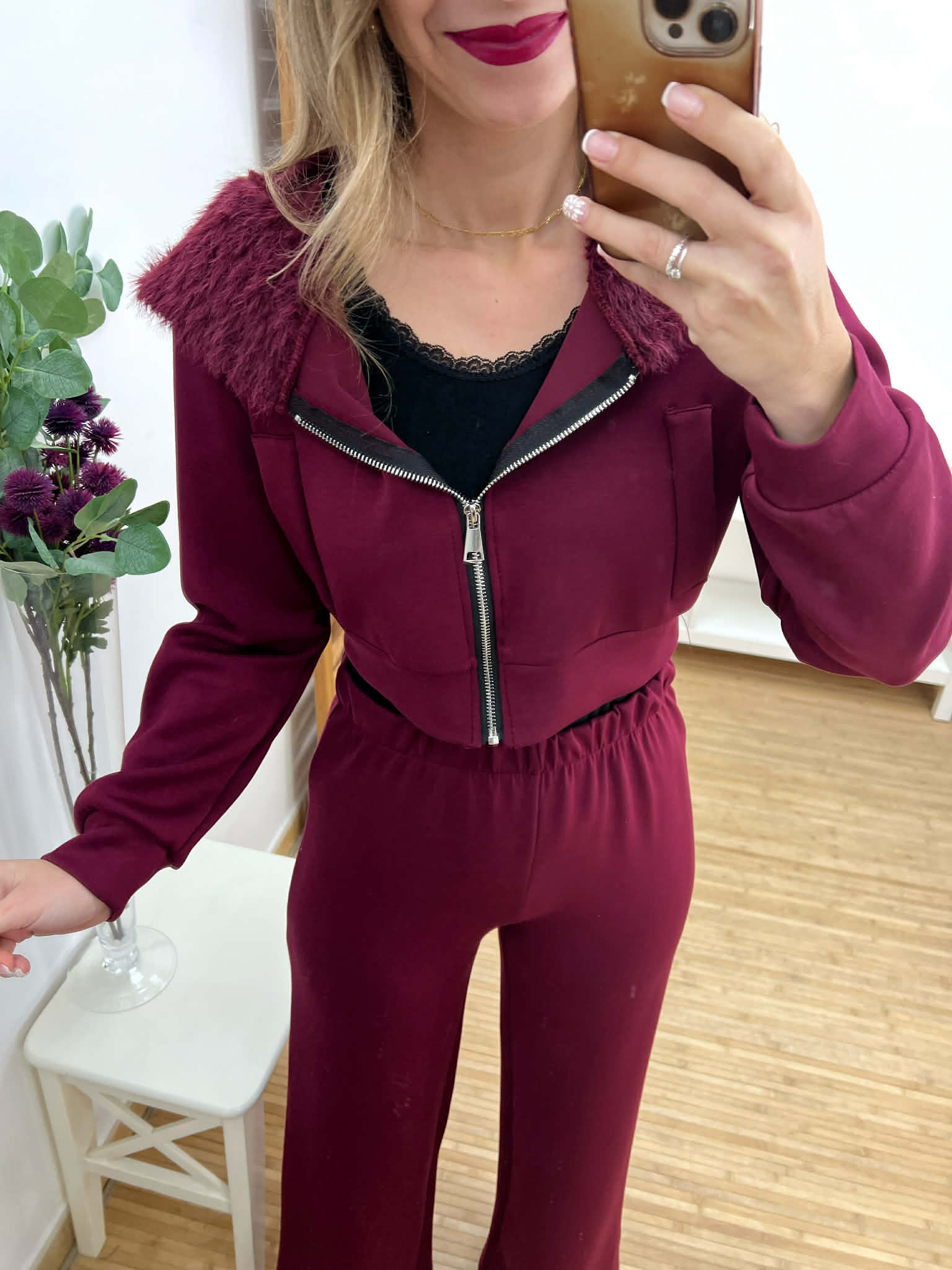 Conjunto en color burdeos de chaqueta crop con pelito en la capucha y pantalón recto con goma en la cintura.