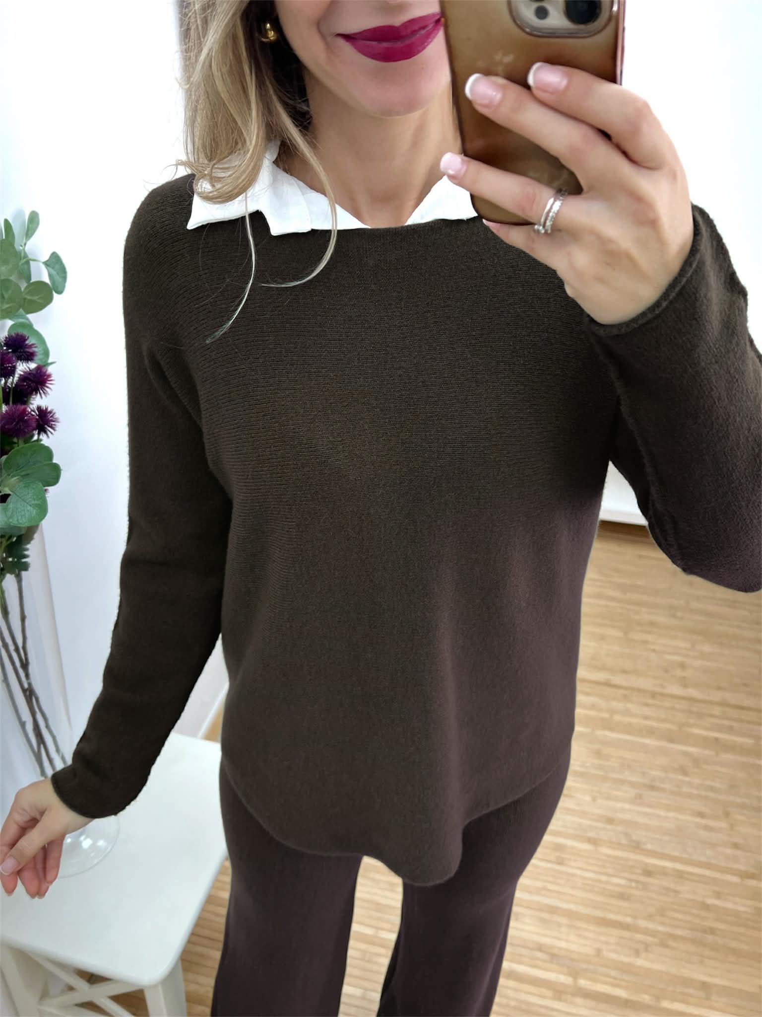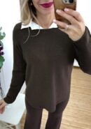 Conjunto de punto suave marrón chocolate de suéter con cuello redondo y bajo redondeado y pantalón recto con goma en la cintura.