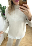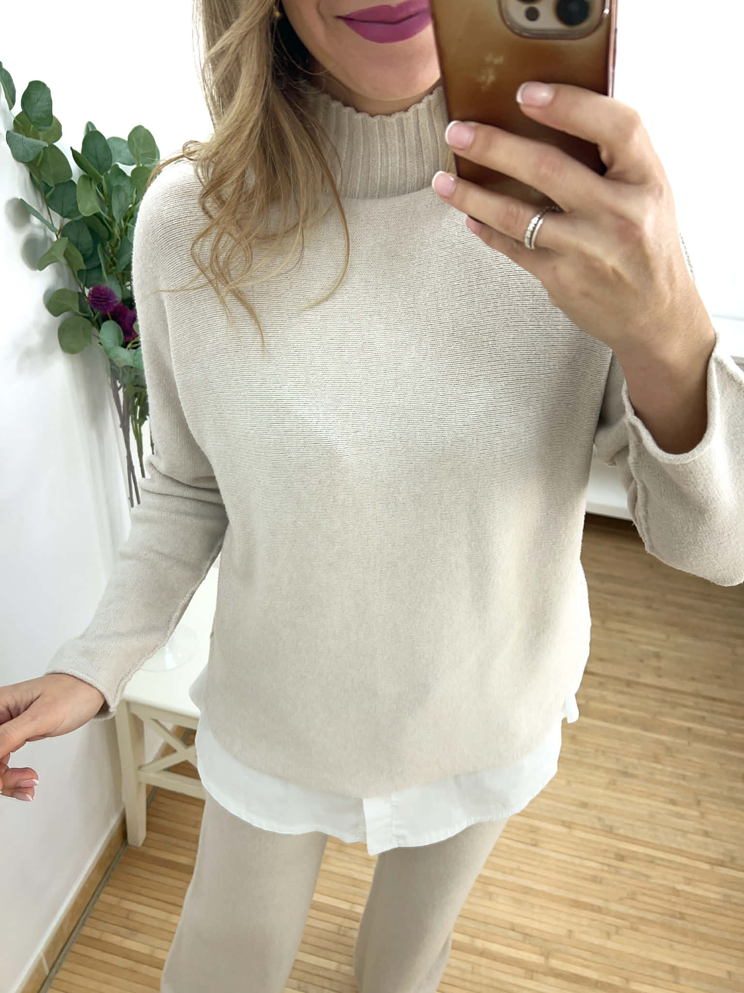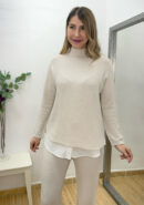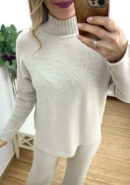 Conjunto beige de punto de jersey ancho con cuello cisne y pantalón recto.