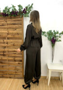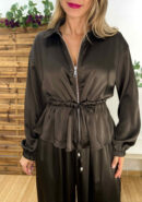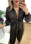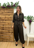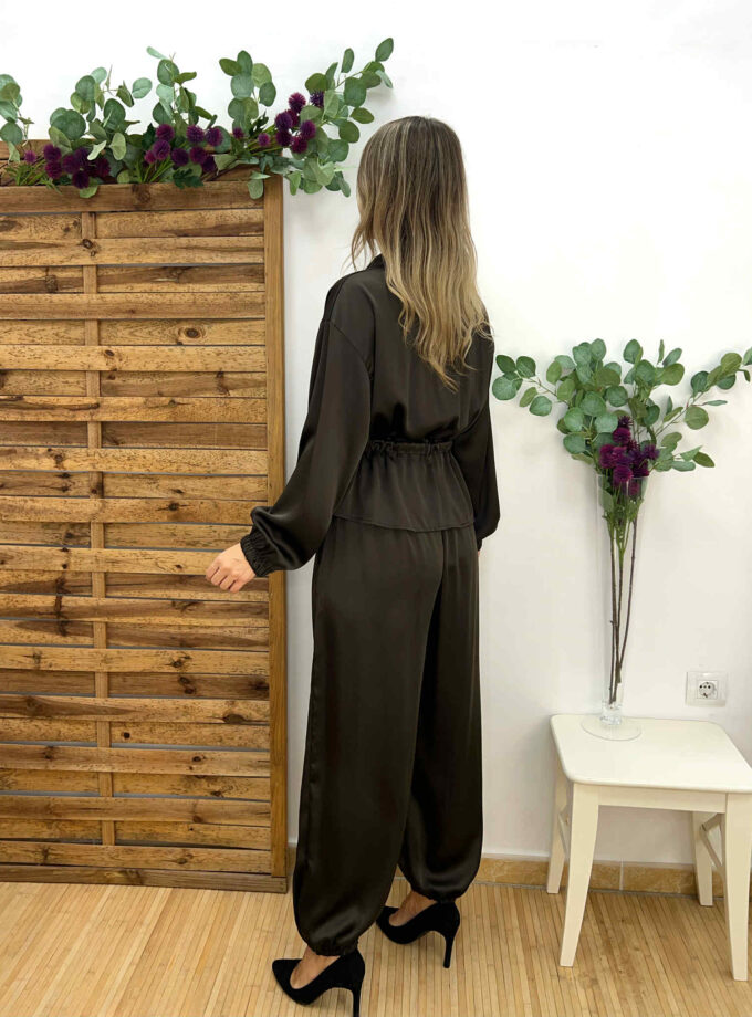 Conjunto satinado marrón chocolate de blusa oversize de manga larga con goma en el puño, cremallera y lazada para ajustar. Pantalón fluido y puño con bolsillos en los laterales y goma en la cintura