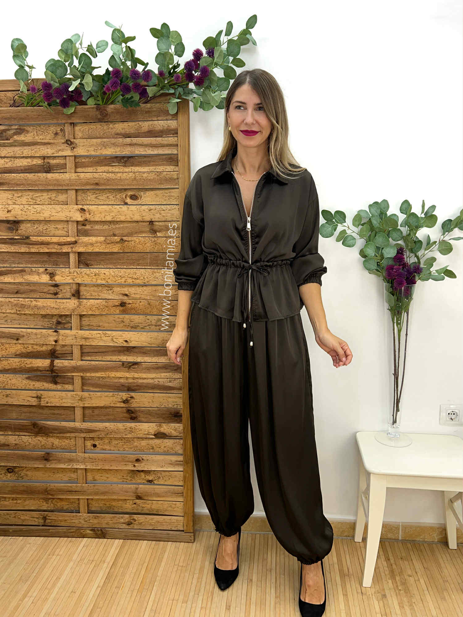 Conjunto satinado marrón chocolate de blusa oversize de manga larga con goma en el puño, cremallera y lazada para ajustar. Pantalón fluido y puño con bolsillos en los laterales y goma en la cintura
