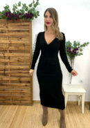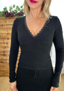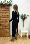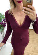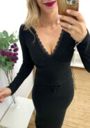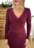 Conjunto canalé de top de manga larga y encaje en escote. Falda midi con abertura trasera, goma en la cintura y lazada. Colores: burdeos y negro