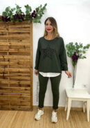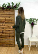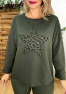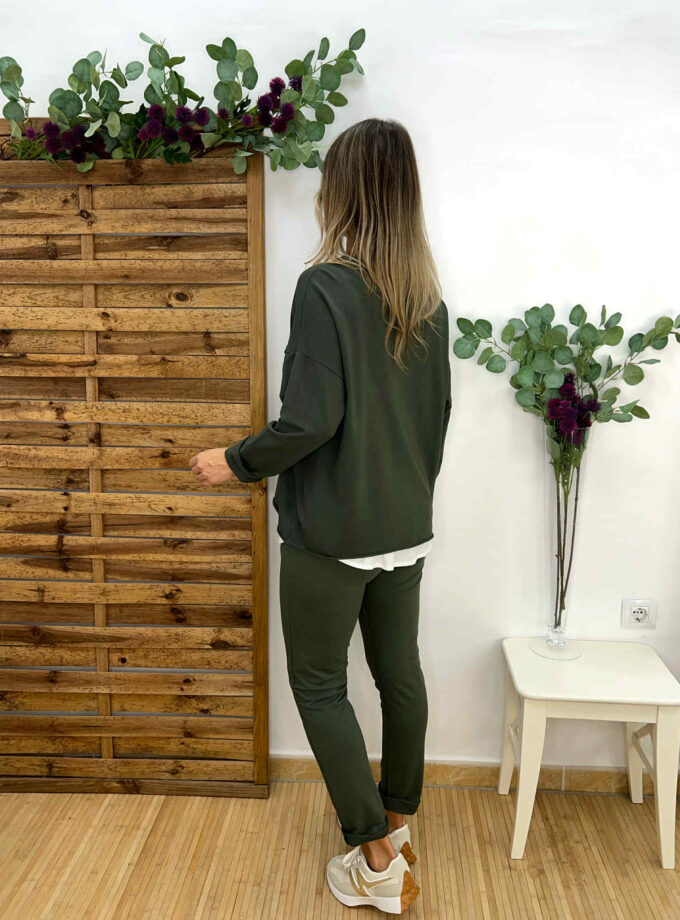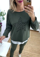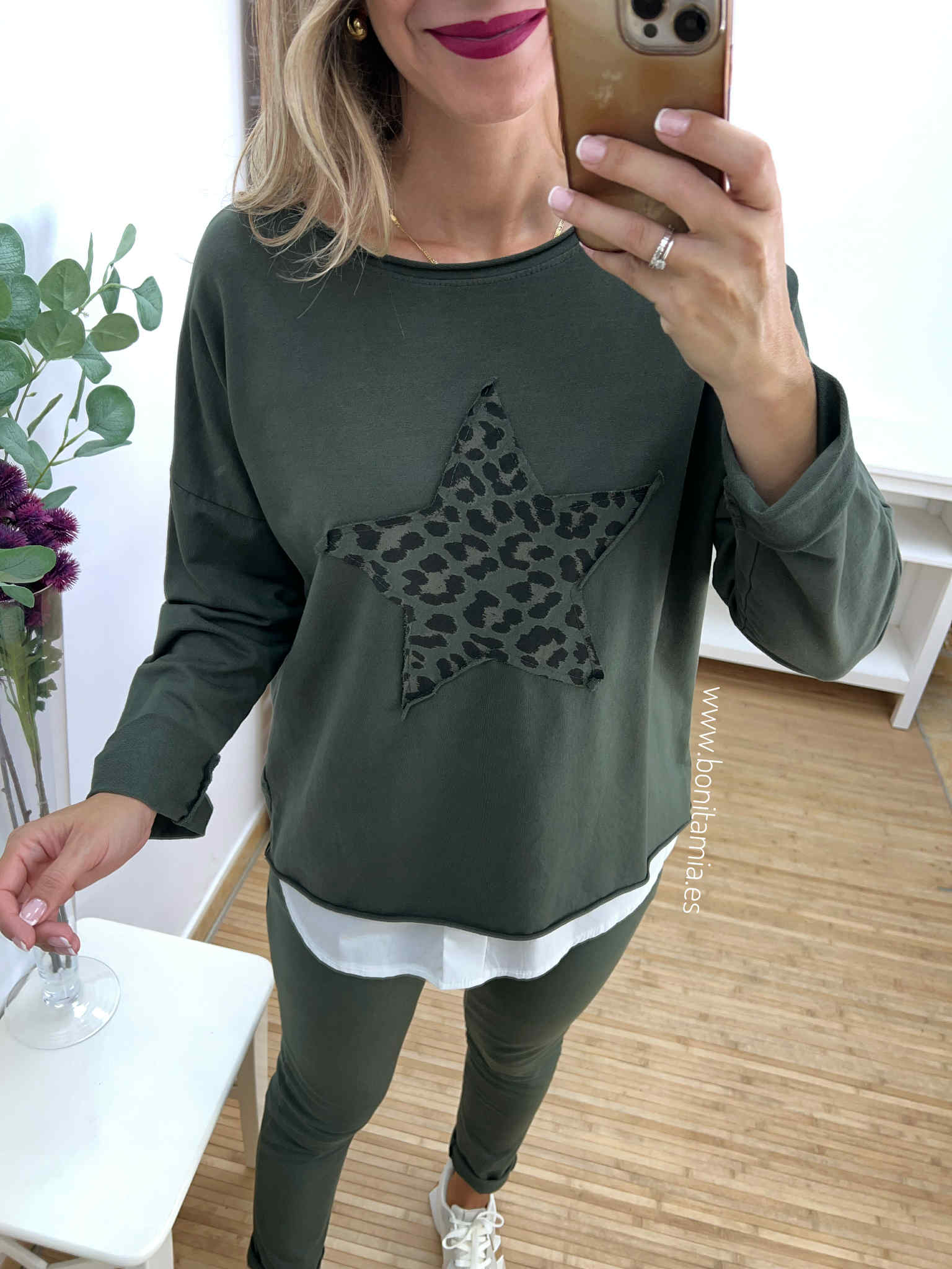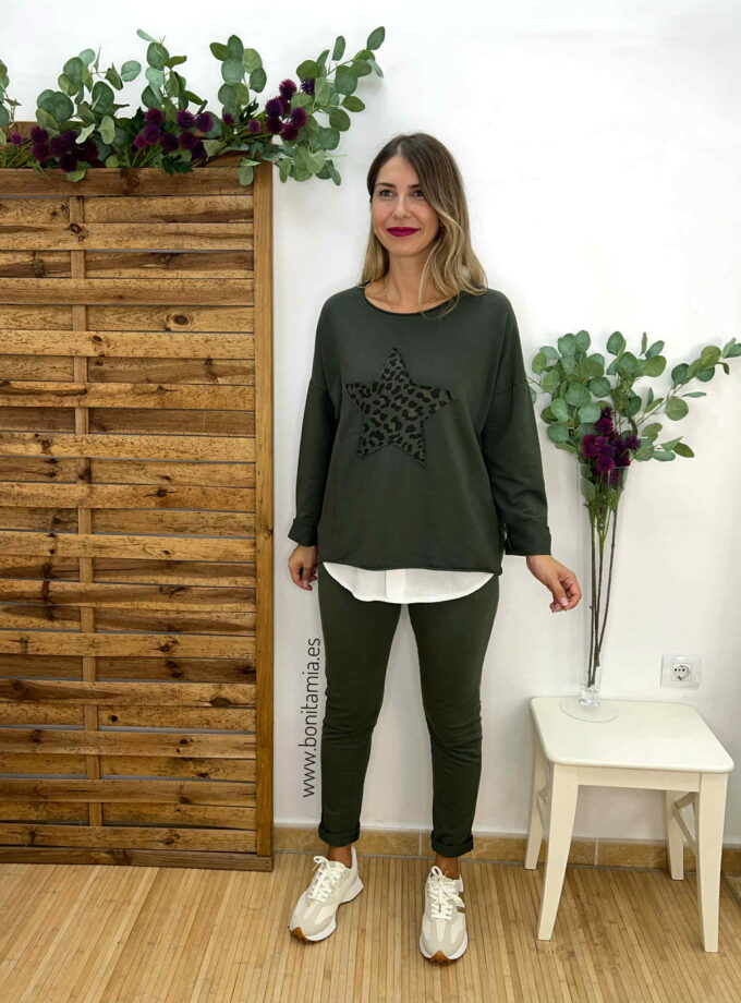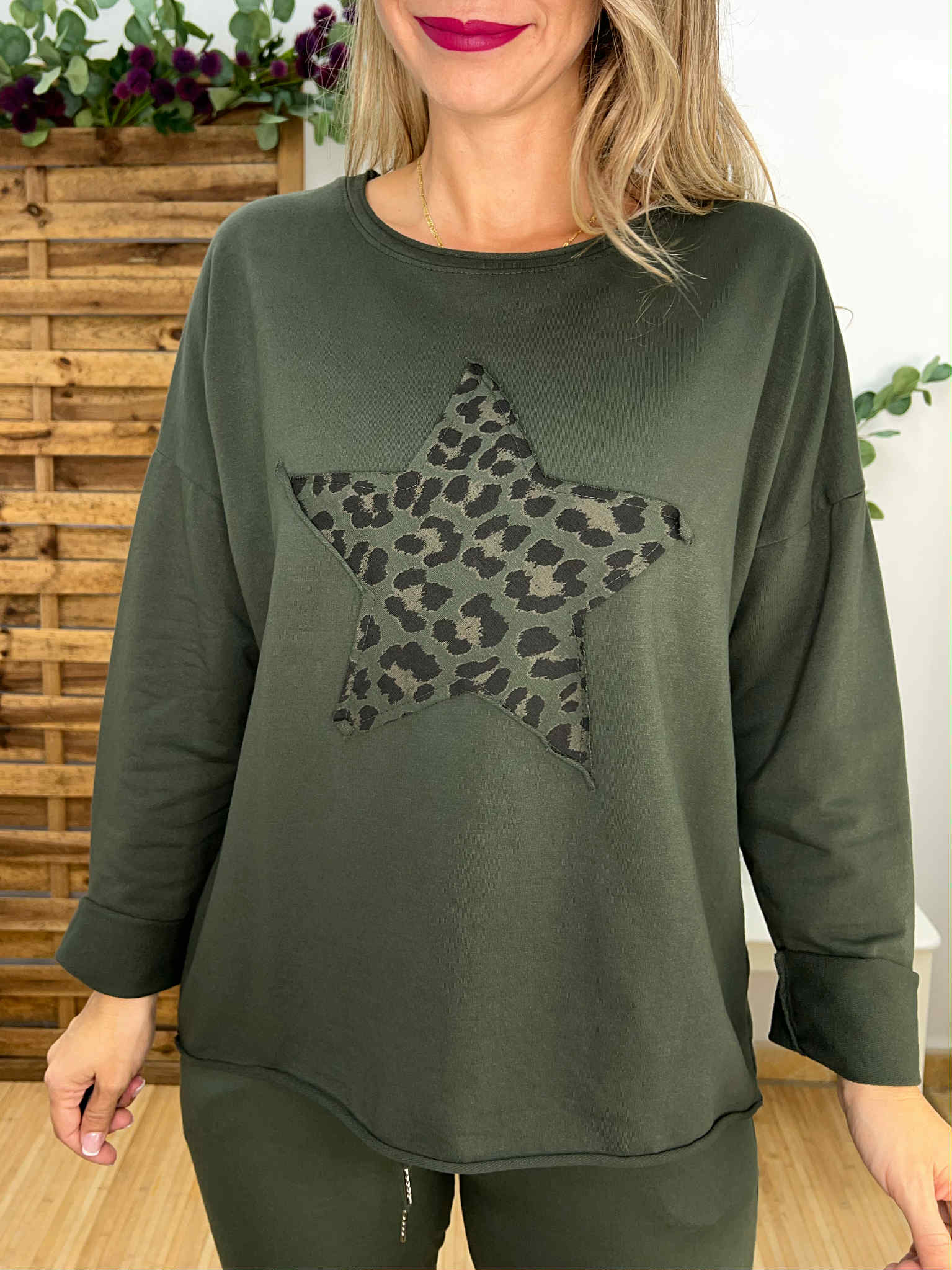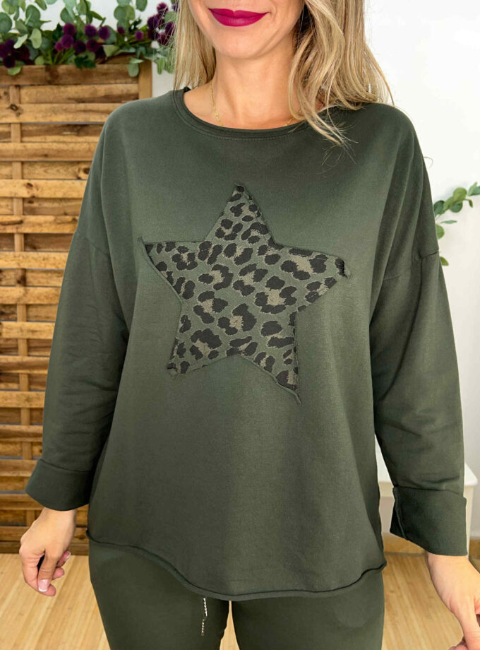 Conjunto en color verde militar de chándal de jersey y pantalón basic. Jersey oversize con dibujo de estrella. Pantalón basic con bolsillos y cordón para ajustar.