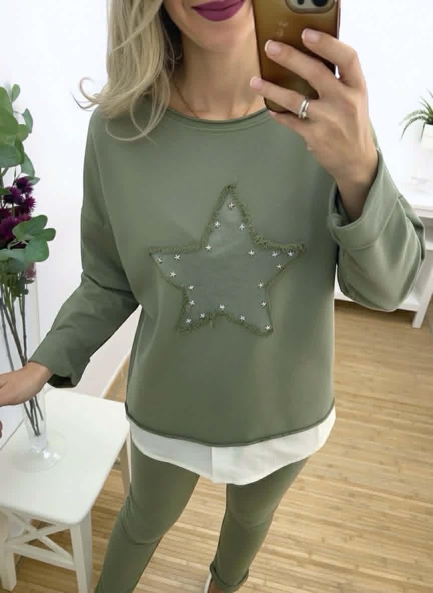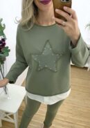 Chándal de algodón verde militar con estrella desflecada y tachuelas. Cuello redondo y corte comfy sin costuras, perfecto para poner con camisa o bajo camisa. Pantalón con bolsillos laterales y lazada para ajustar.