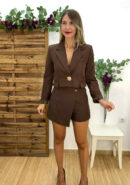 Conjunto de blazzer corta y falda pantalón marrón chocolate. Blazzer con solapas, forro interior y adorno dorado. Lleva hombreras. Falda pantalón con goma en la cintura.