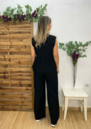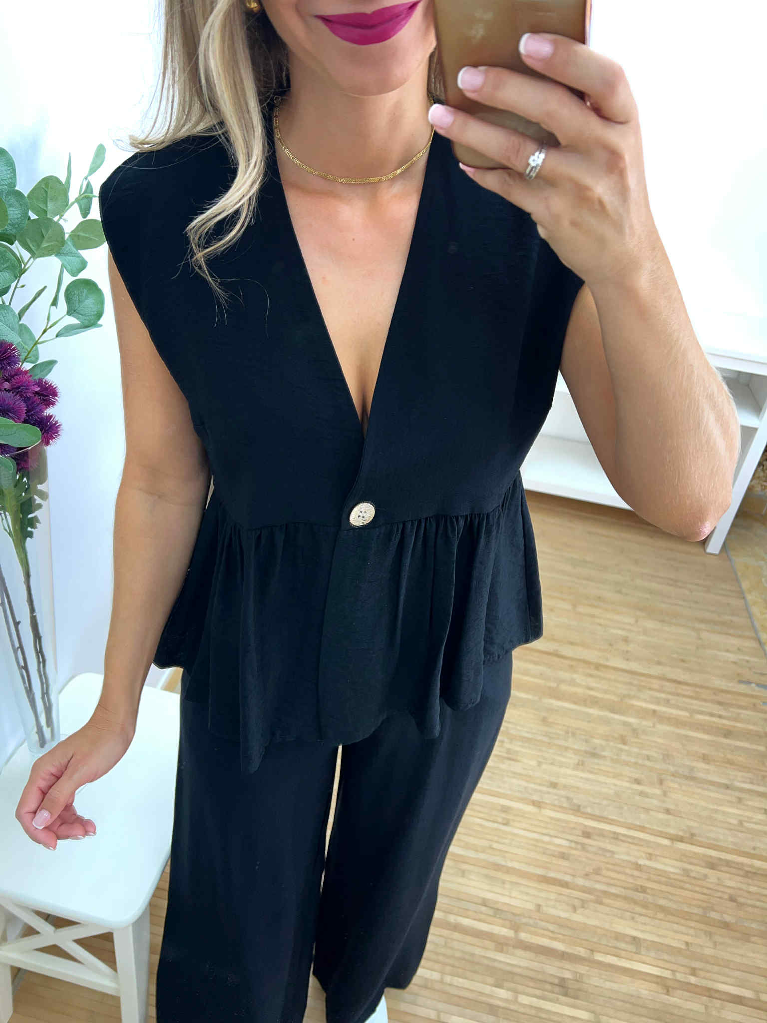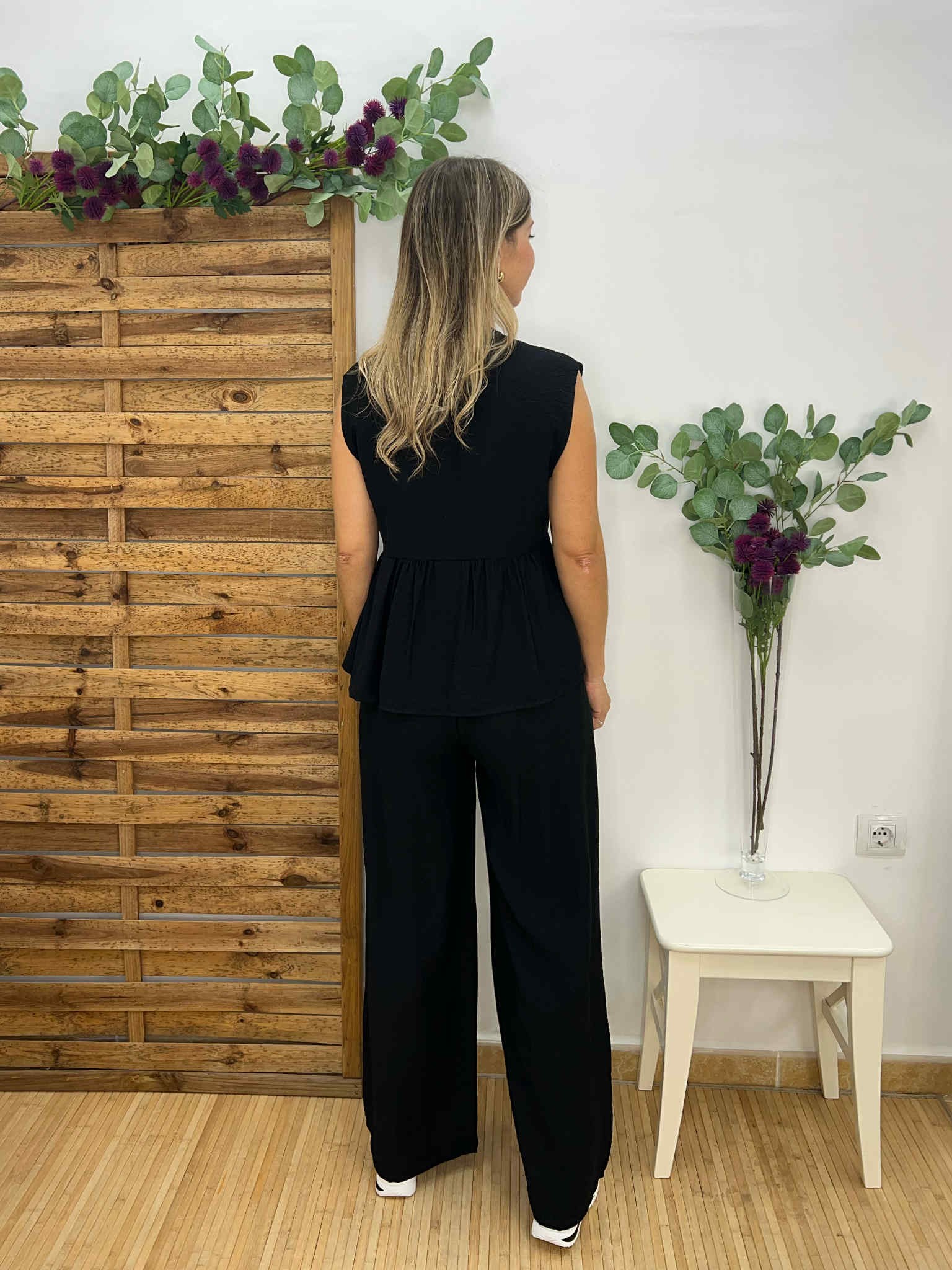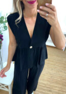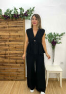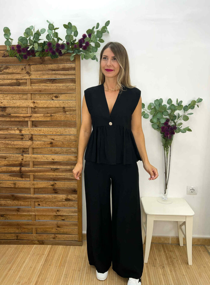Conjunto top y pantalón negro. Top con volante y botón dorado y pantalón con goma en la cintura, botón dorado, bolsillos y cremallera. Tejido con textura. Talla única, recomendado S, M, L.