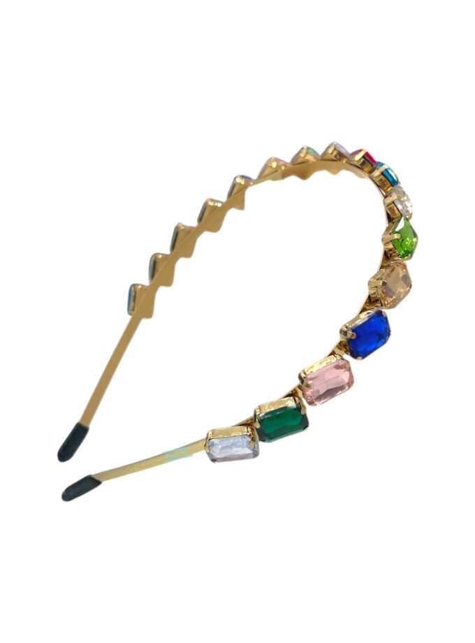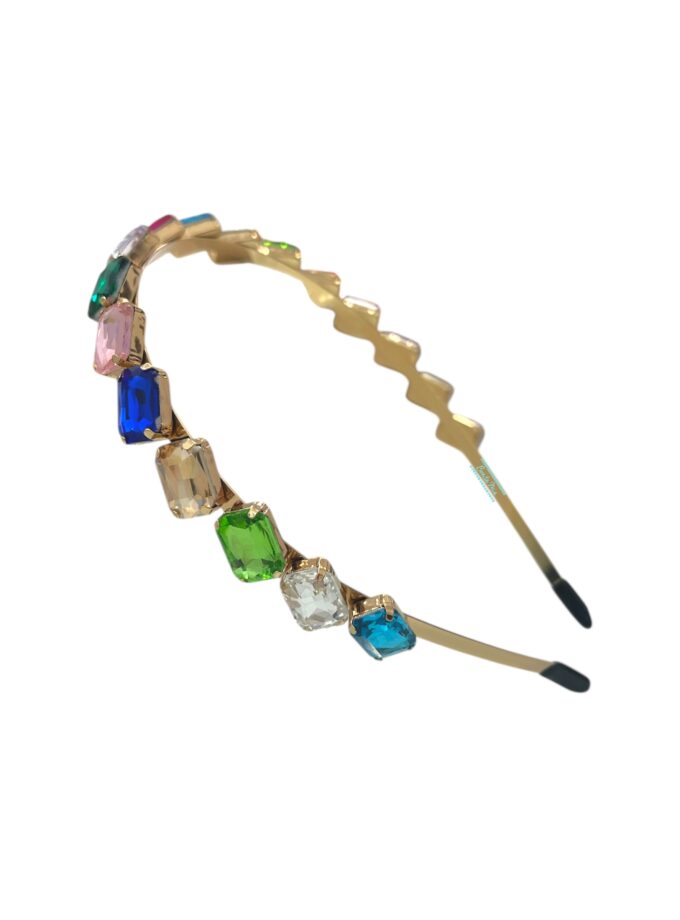 Diadema metálica dorada con detalle de cristales rectangulares multicolor (azul, rosa, verde, dorado…). Protección de silicona en ambos finales de la diadema.