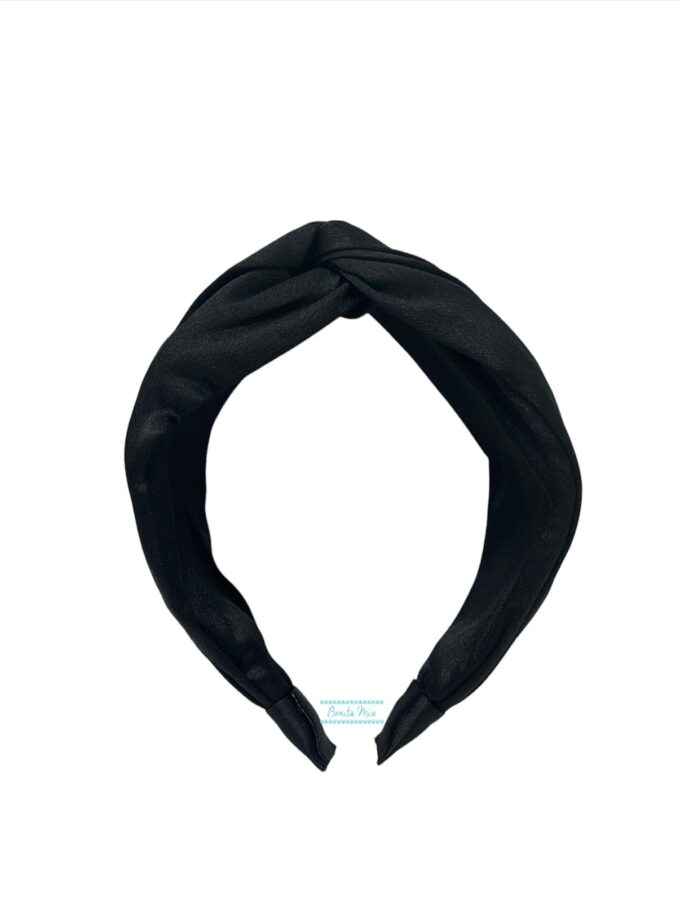 Diadema en color negro de tejido satén con nudo entrelazado decorativo.
