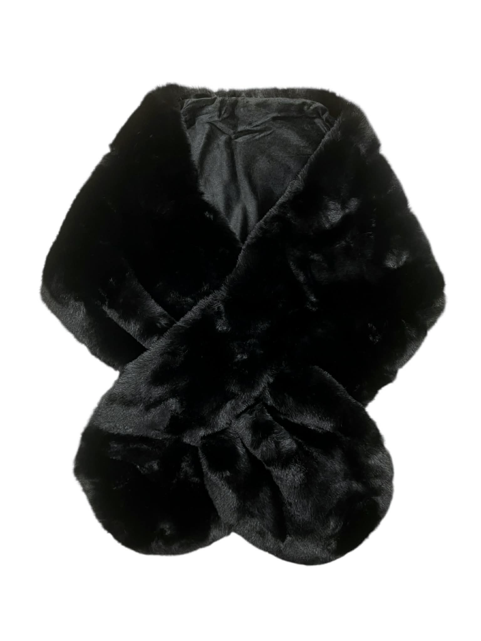 Estola negra de pelo sintético con tacto suave, fruncida en ambos extremo, forro interior de raso y cierre de cruce.