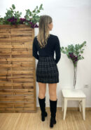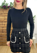 Falda corta de punto negra de cuadros y tweed en los bolsillos con botones dorados y mini perlas.