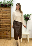 Falda midi de polipiel marrón chocolate con botón y cremallera delantera. Abertura delantera y bolsillos delanteros.