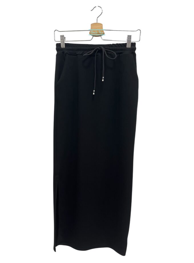 Falda midi con goma en la cintura y lazada para ajustar. Lleva bolsillos en ambos laterales y abertura lateral derecha. Colores disponibles: chocolate y negro.