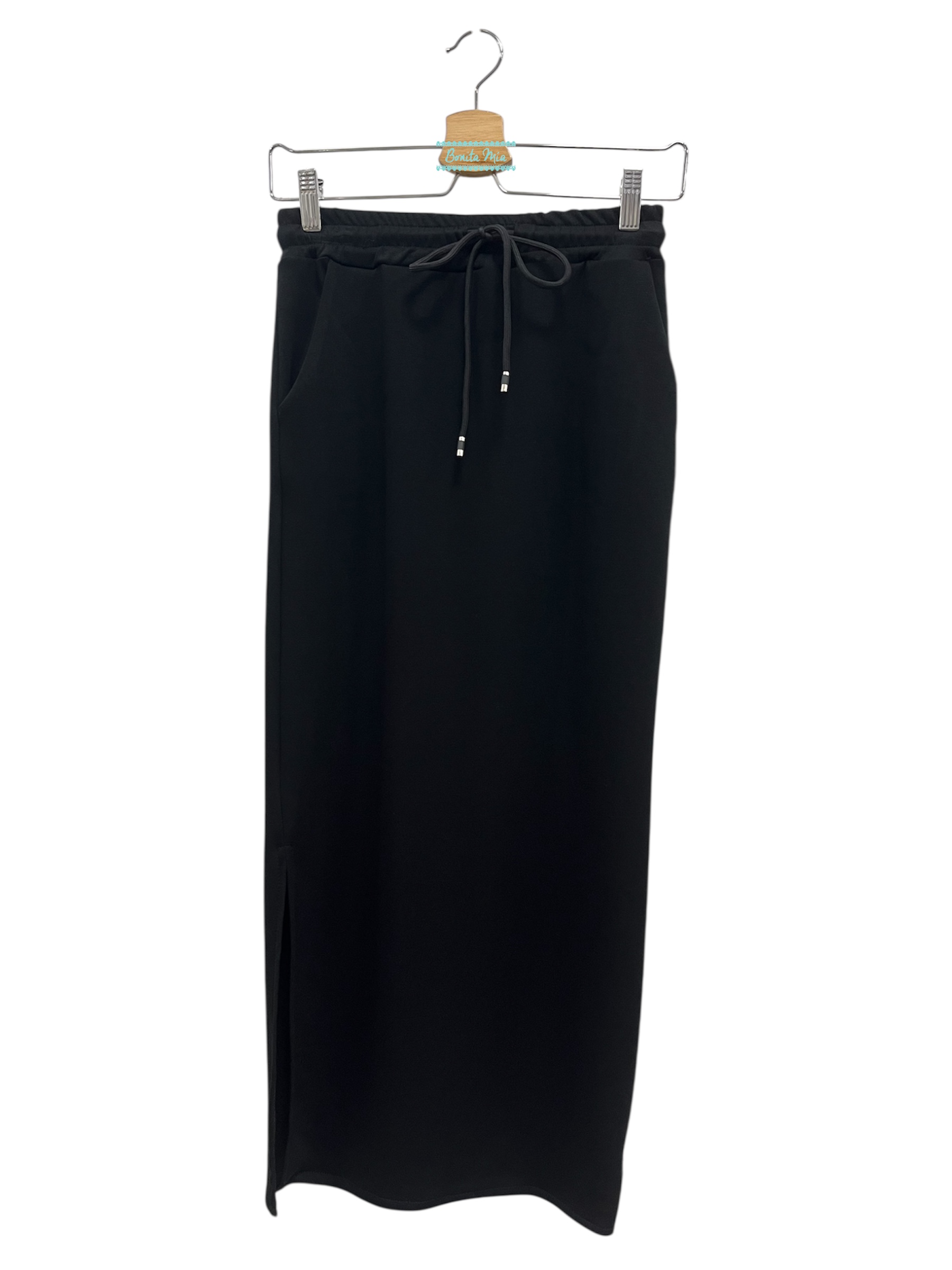 Falda midi con goma en la cintura y lazada para ajustar. Lleva bolsillos en ambos laterales y abertura lateral derecha. Colores disponibles: chocolate y negro.