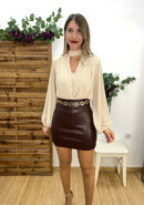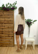 Falda corta de polipiel chocolate con cinturón polipiel negro. Cremallera invisible trasera.