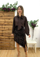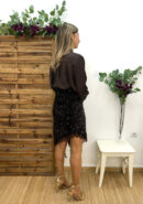 Falda corta asimétrica negra de lentejuelas y detalle de encaje en el filo. Lleva goma en la cintura y forro interior.