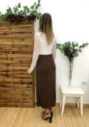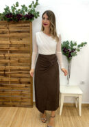 Falda midi elástica en color chocolate cruzada con hebilla redonda y strass.