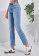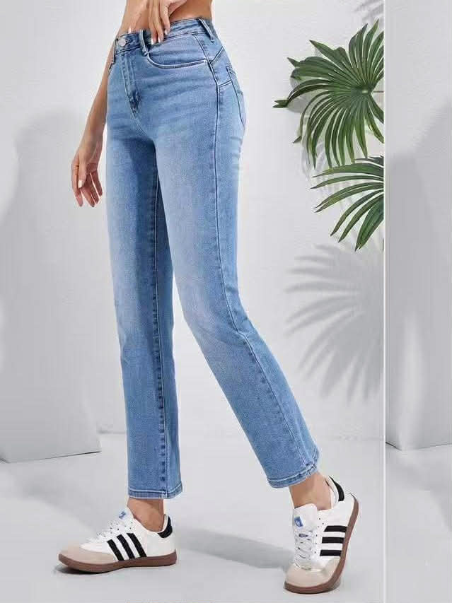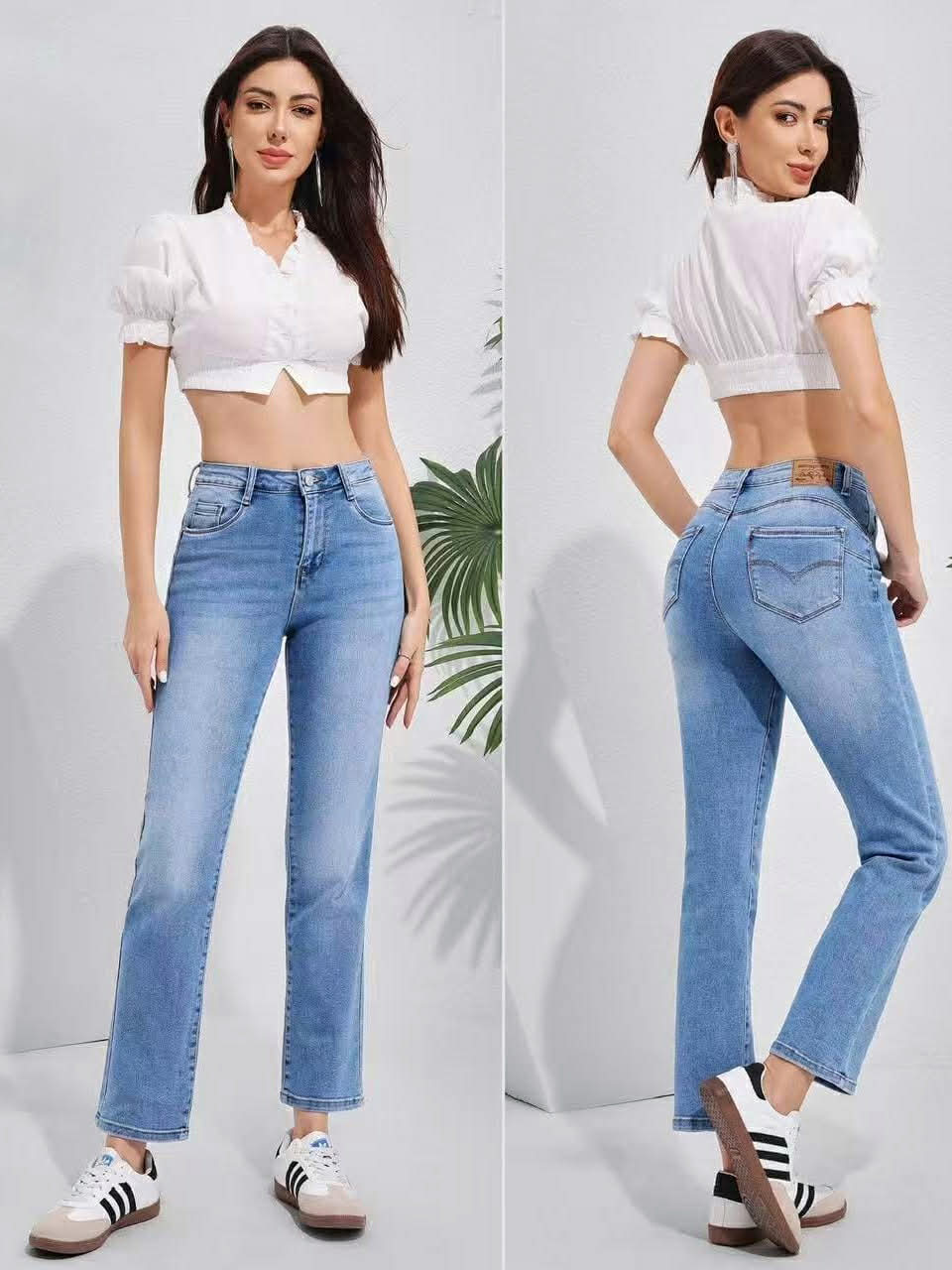 Jeans rectos color vaquero claro efecto desgastado con bolsillos.