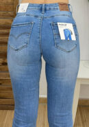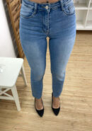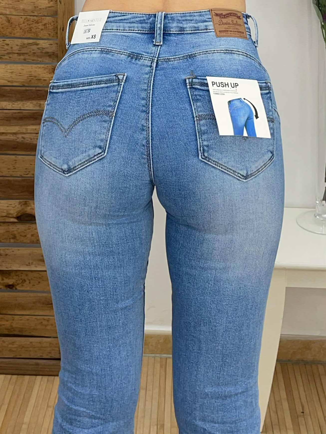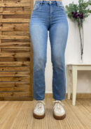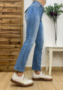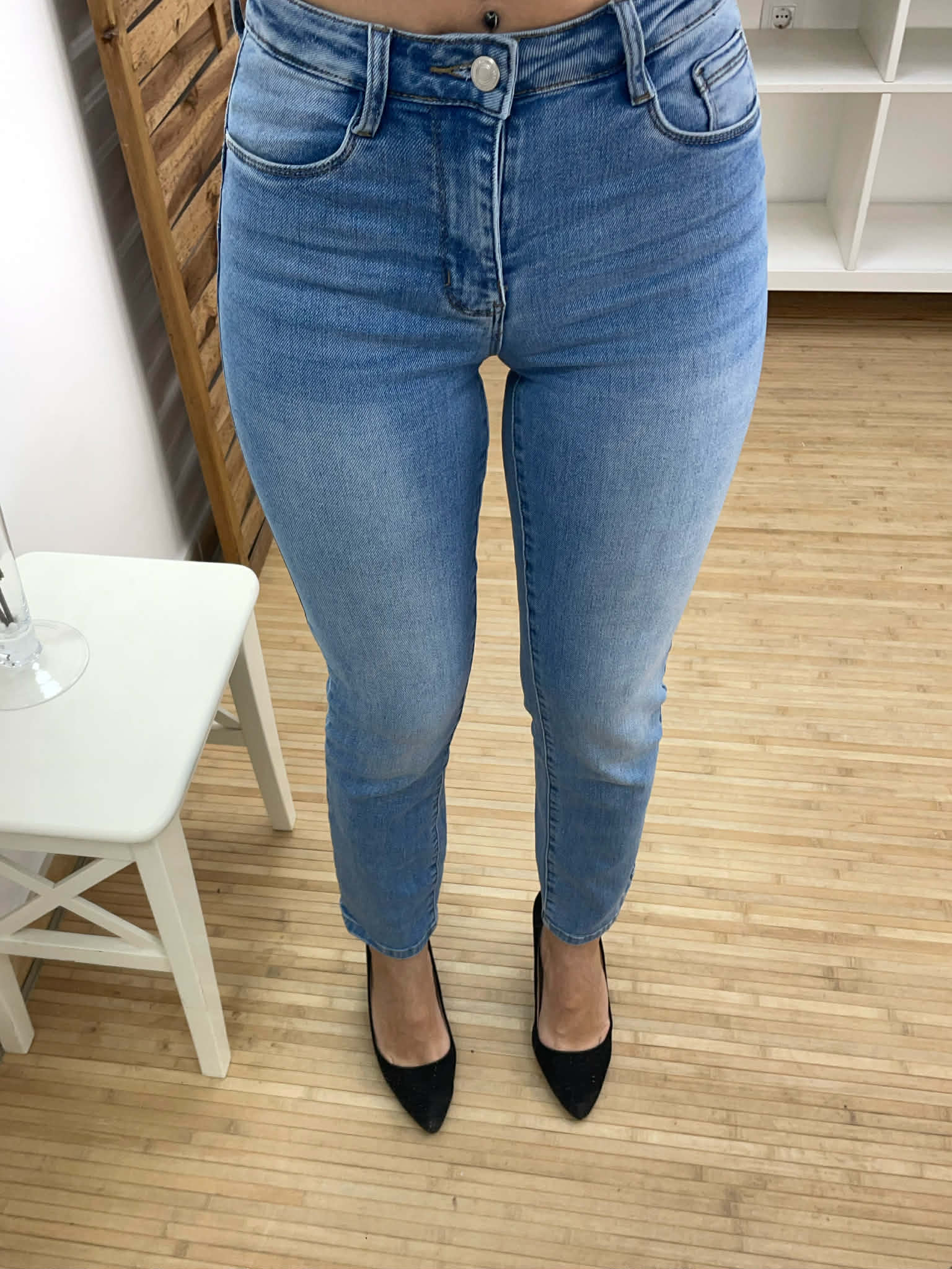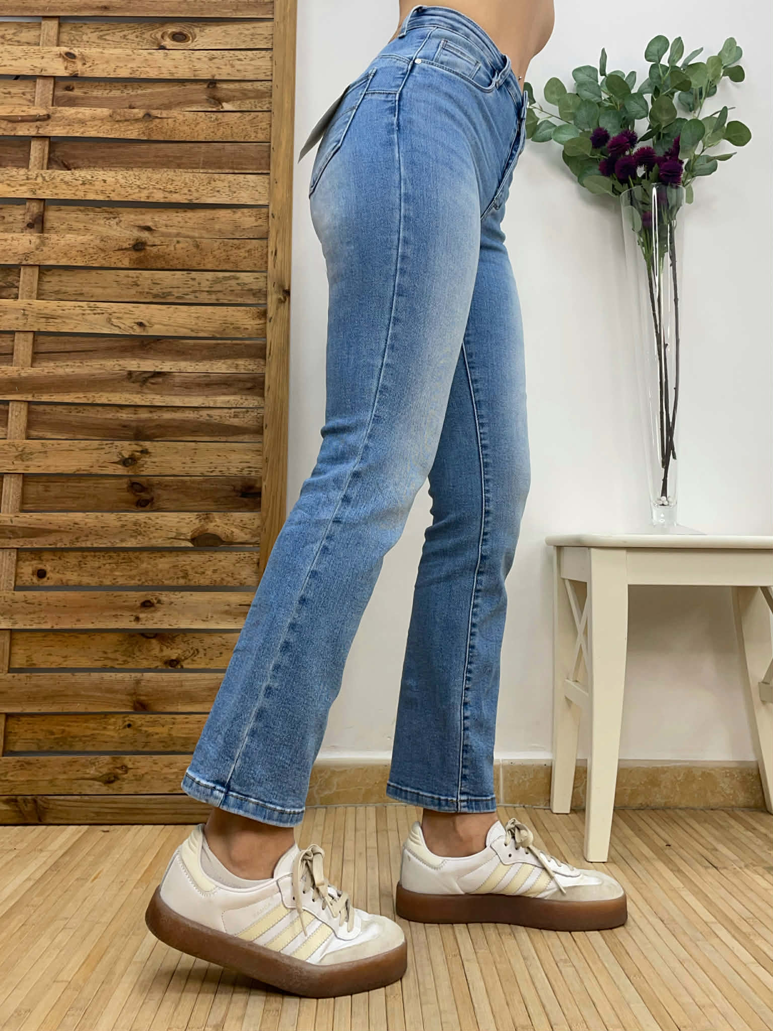 Jeans recto color vaquero claro efecto desgastado con bolsillos y corte cropped.