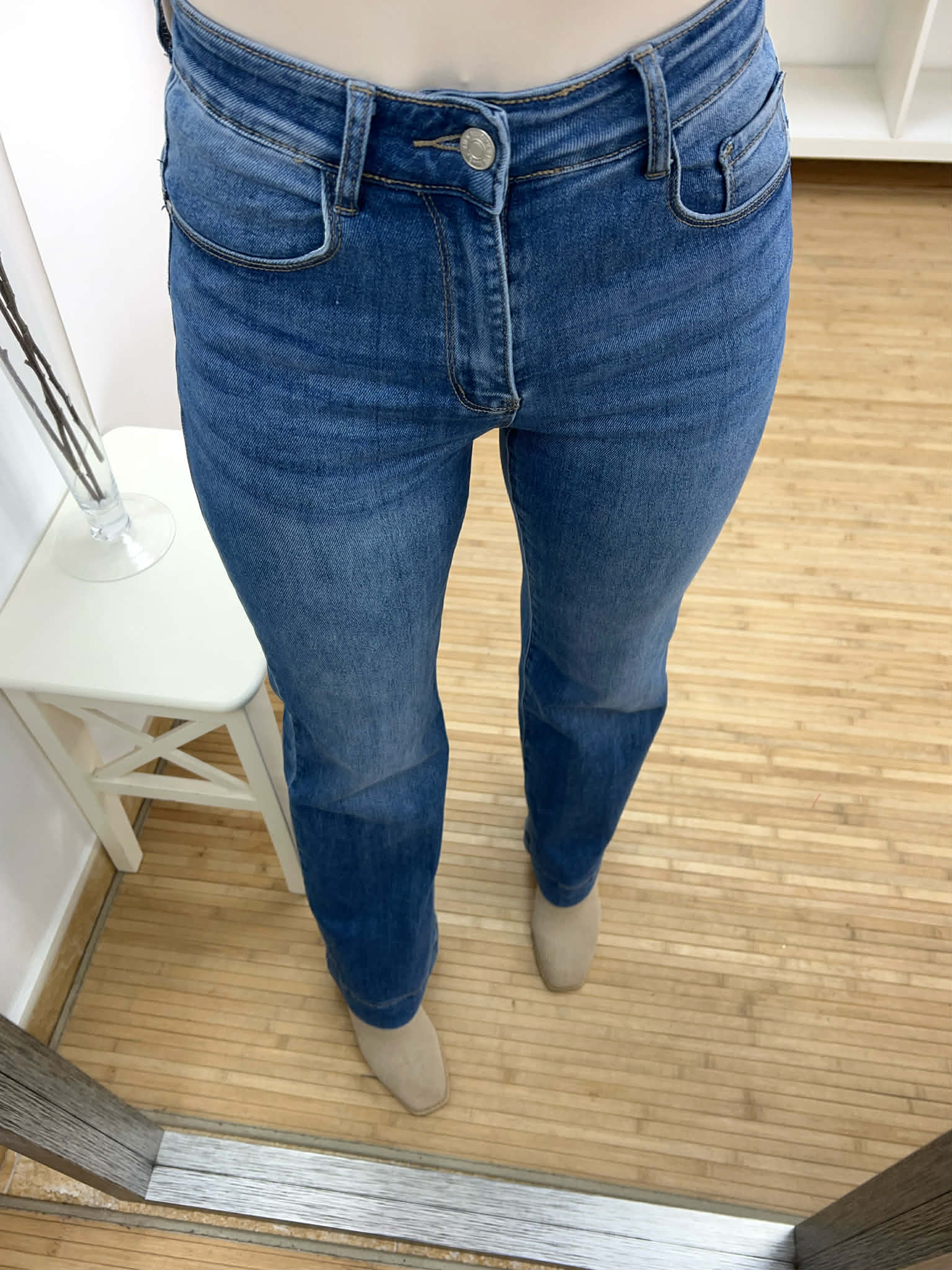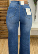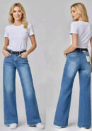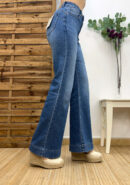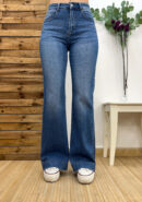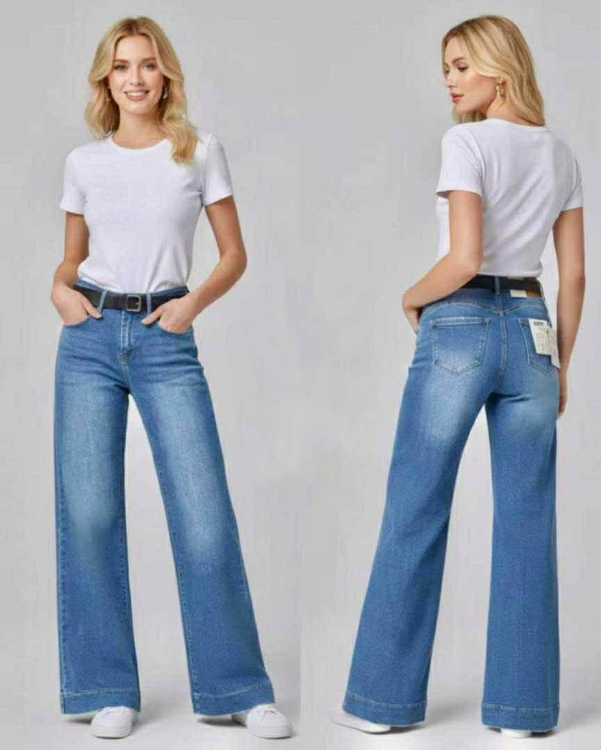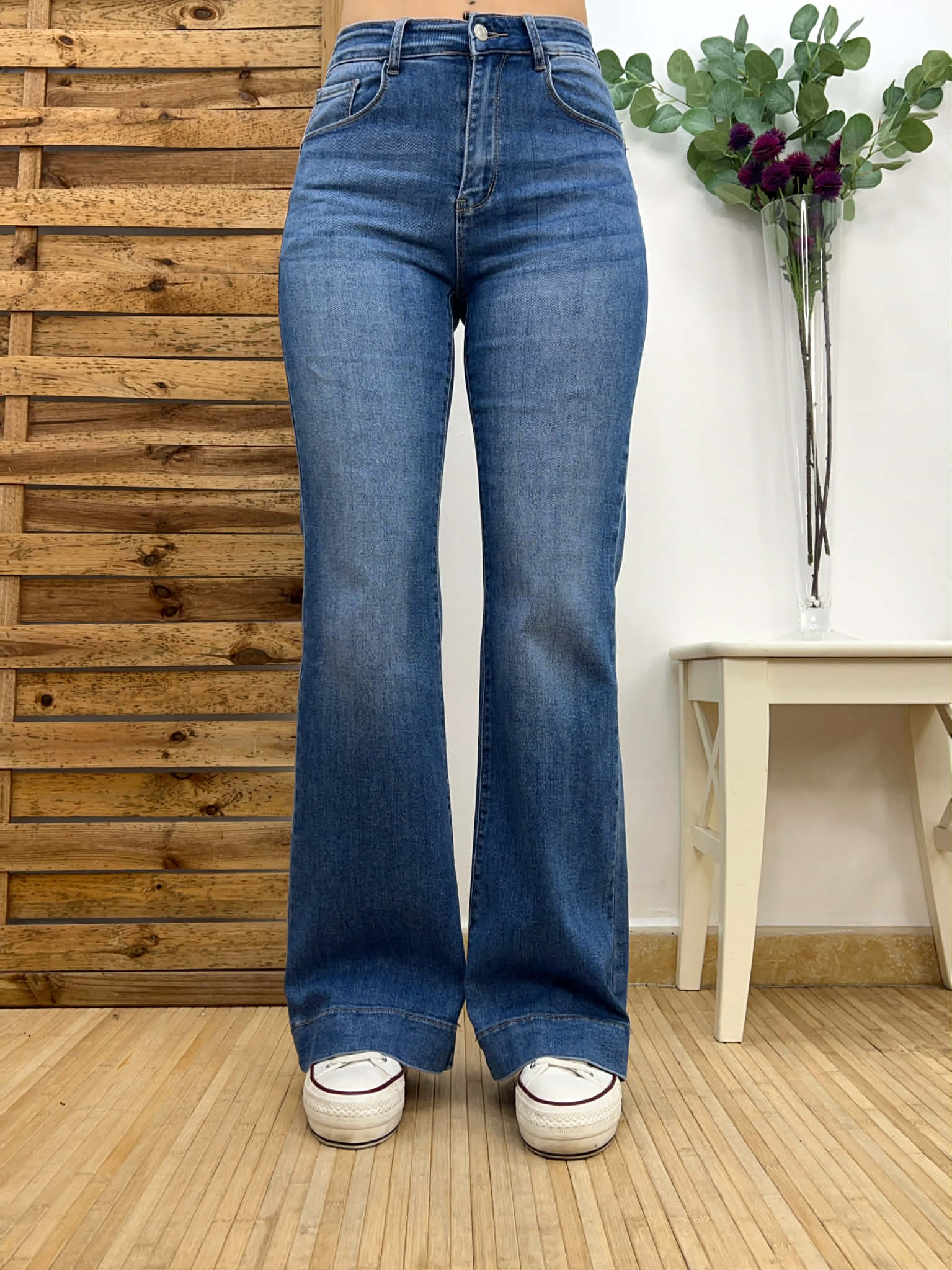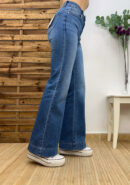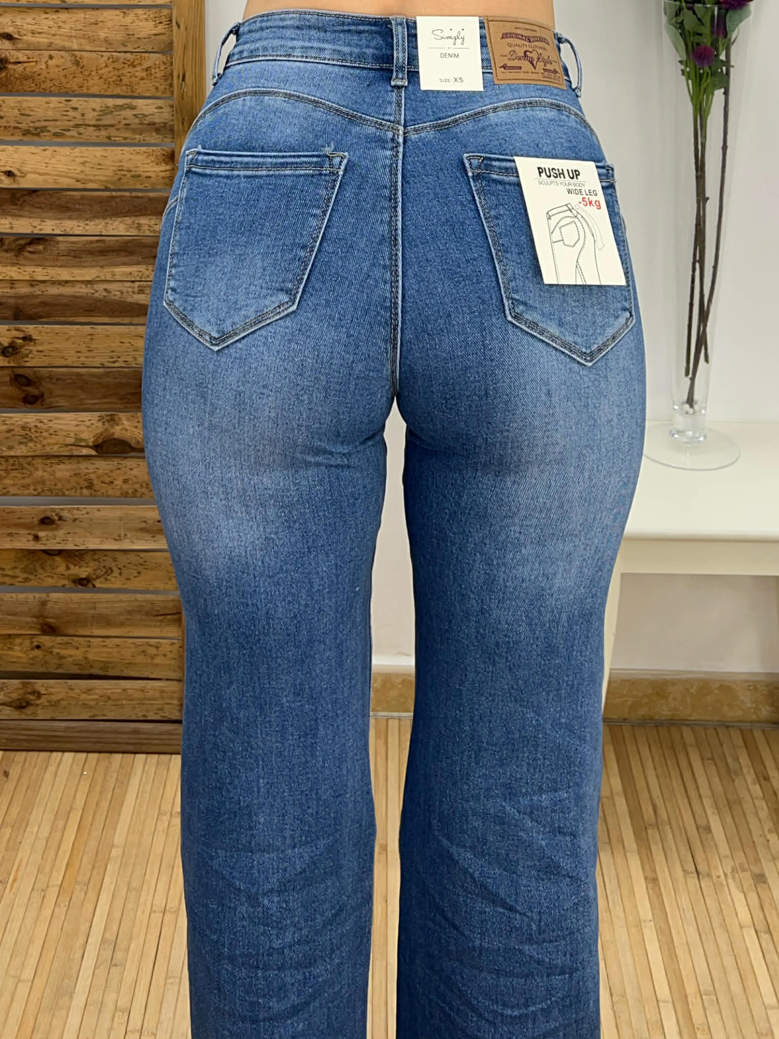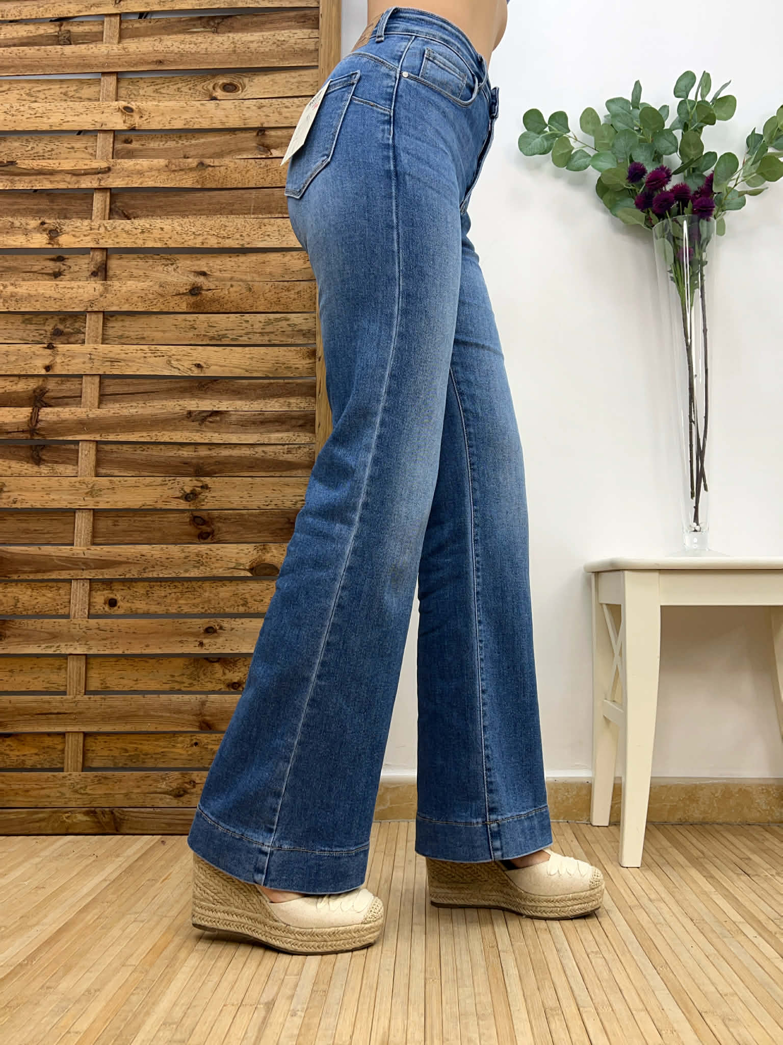 Jeans rectos (wide leg) color vaquero medio con bolsillos. Incluye cinturón de polipiel negro.