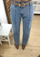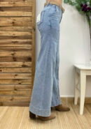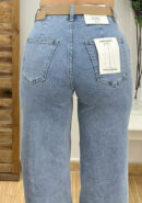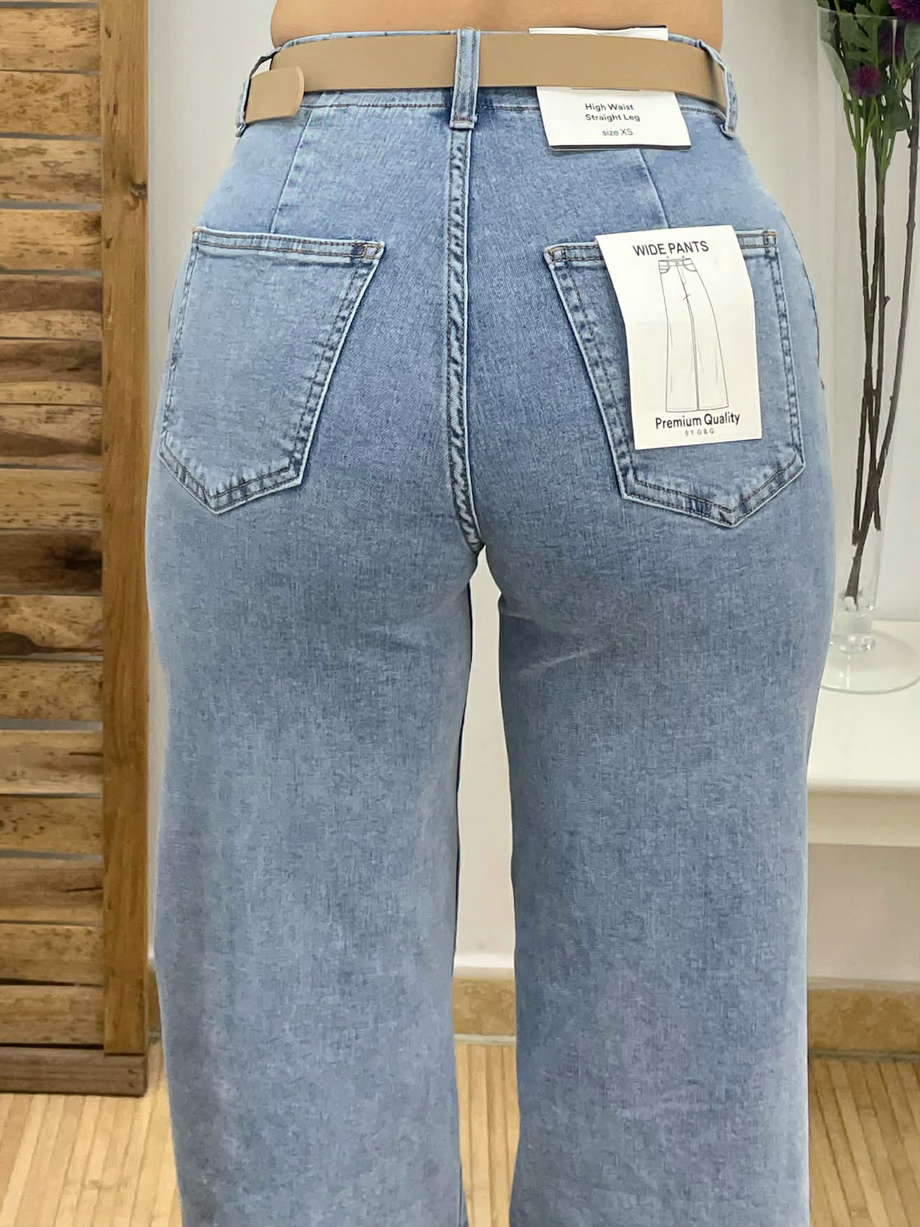 Jeans rectos (wide leg) color vaquero claro con bolsillos y línea. Incluye cinturón de polipiel negro.