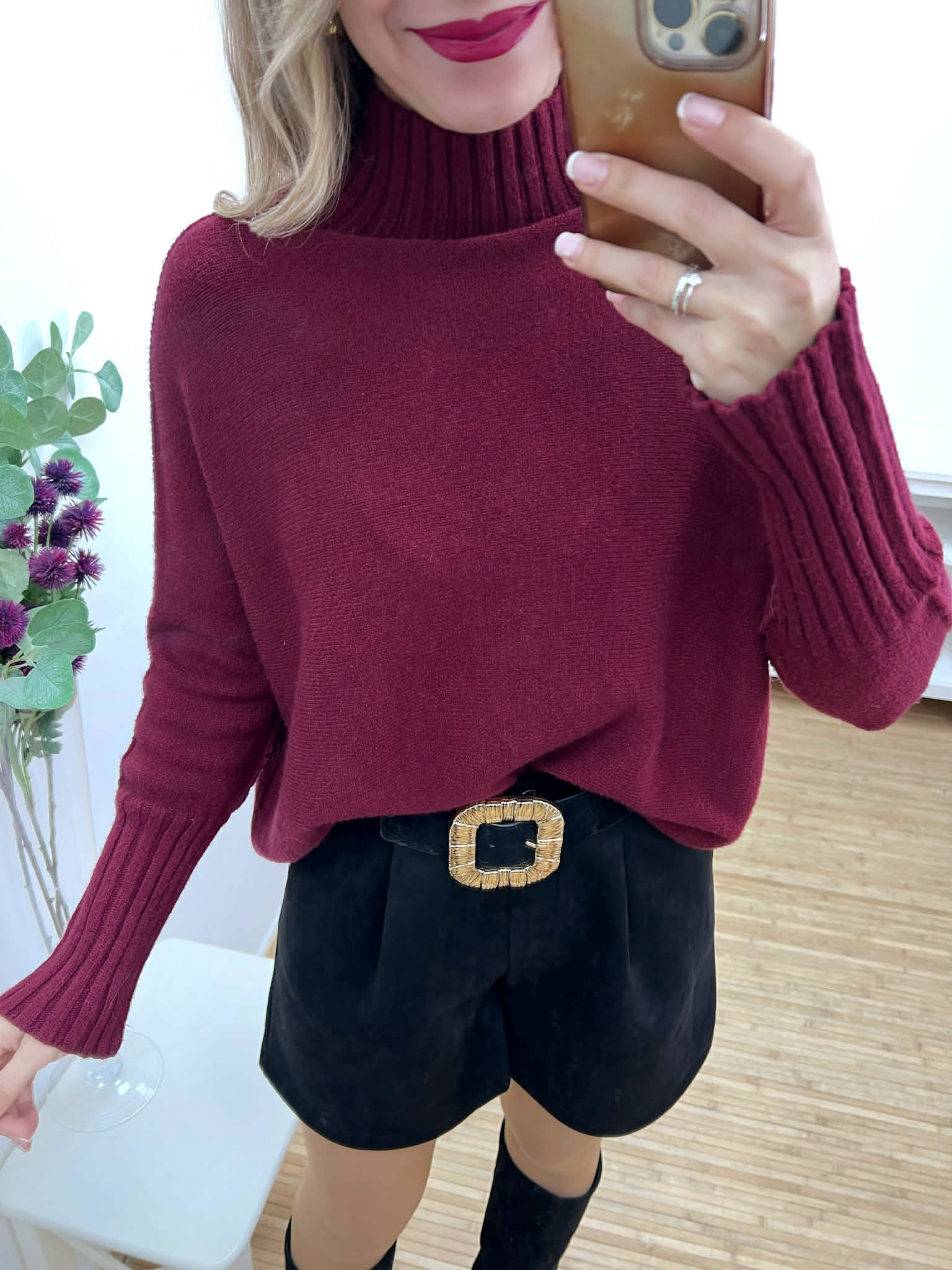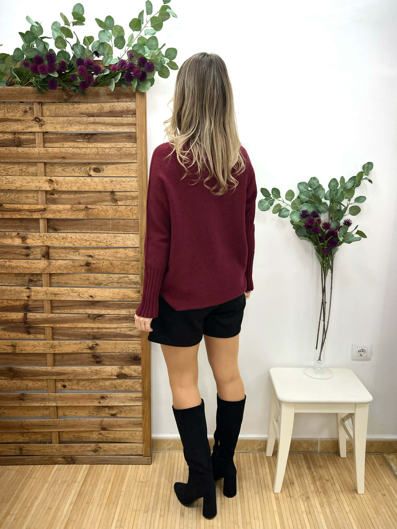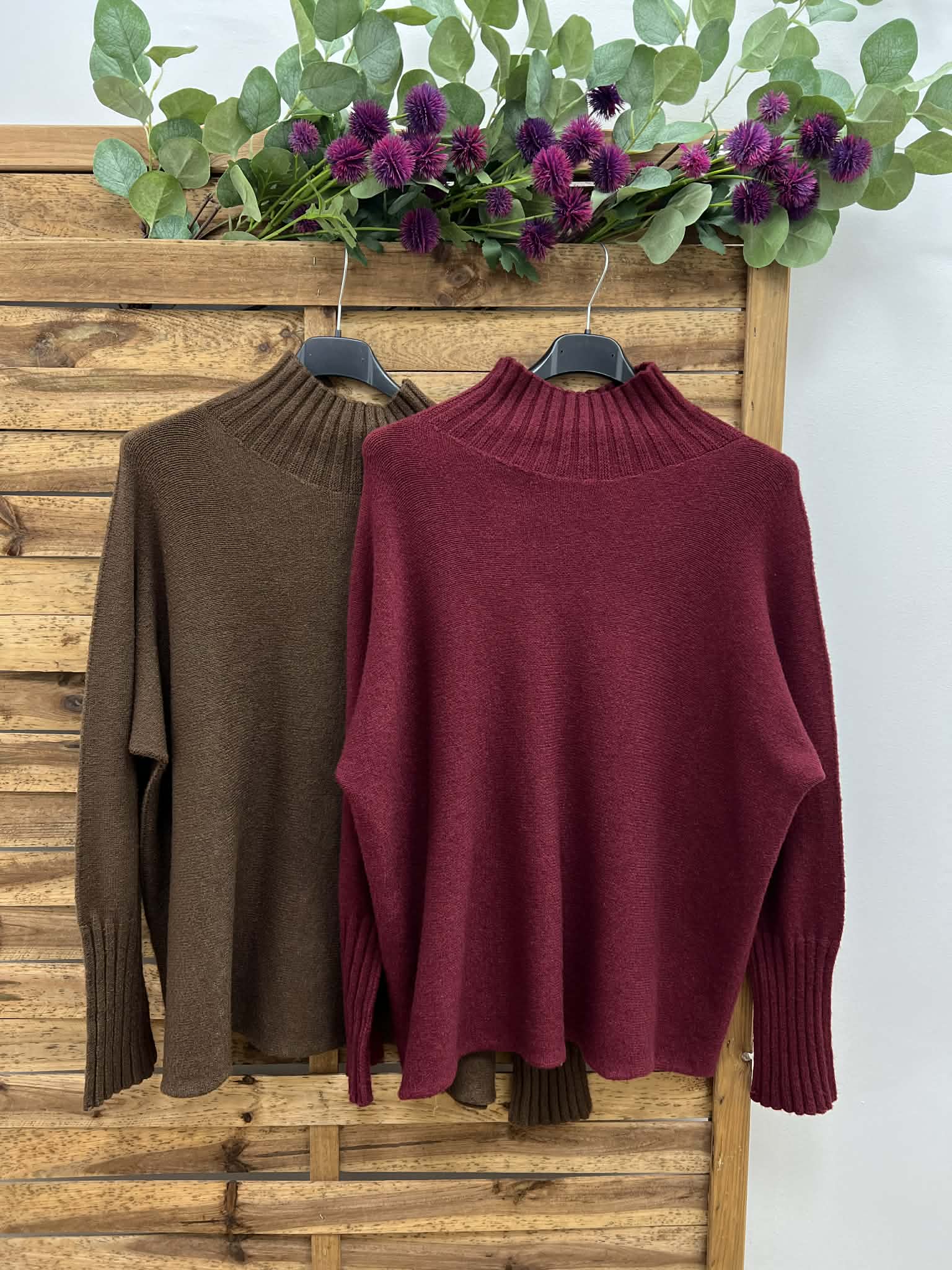 Jersey de punto con cuello perkins. Colores disponibles: burdeos y marrón chocolate.