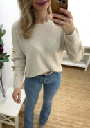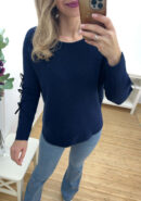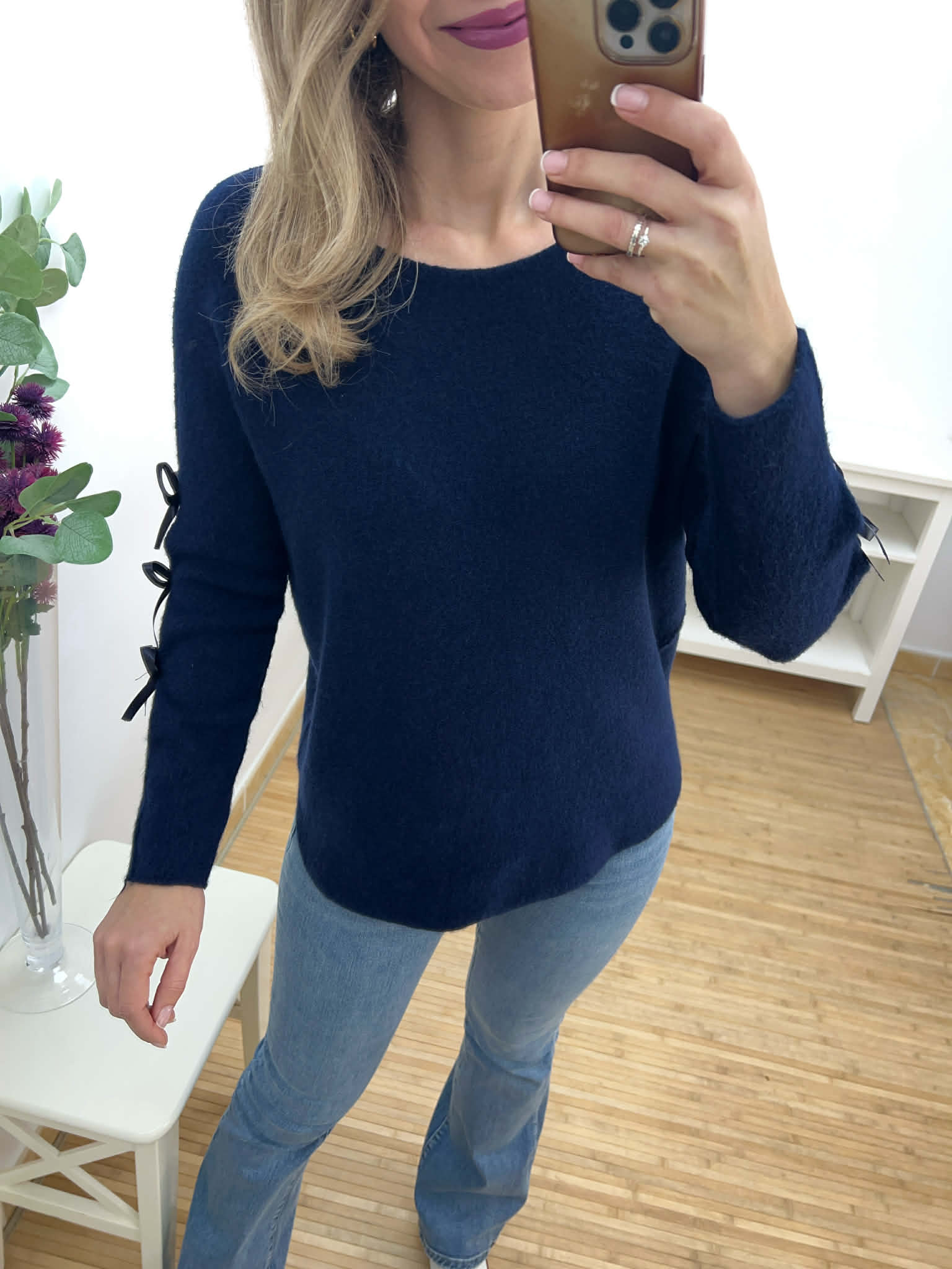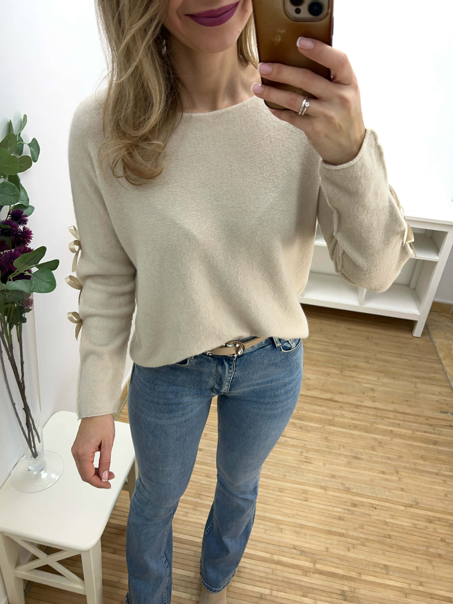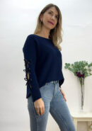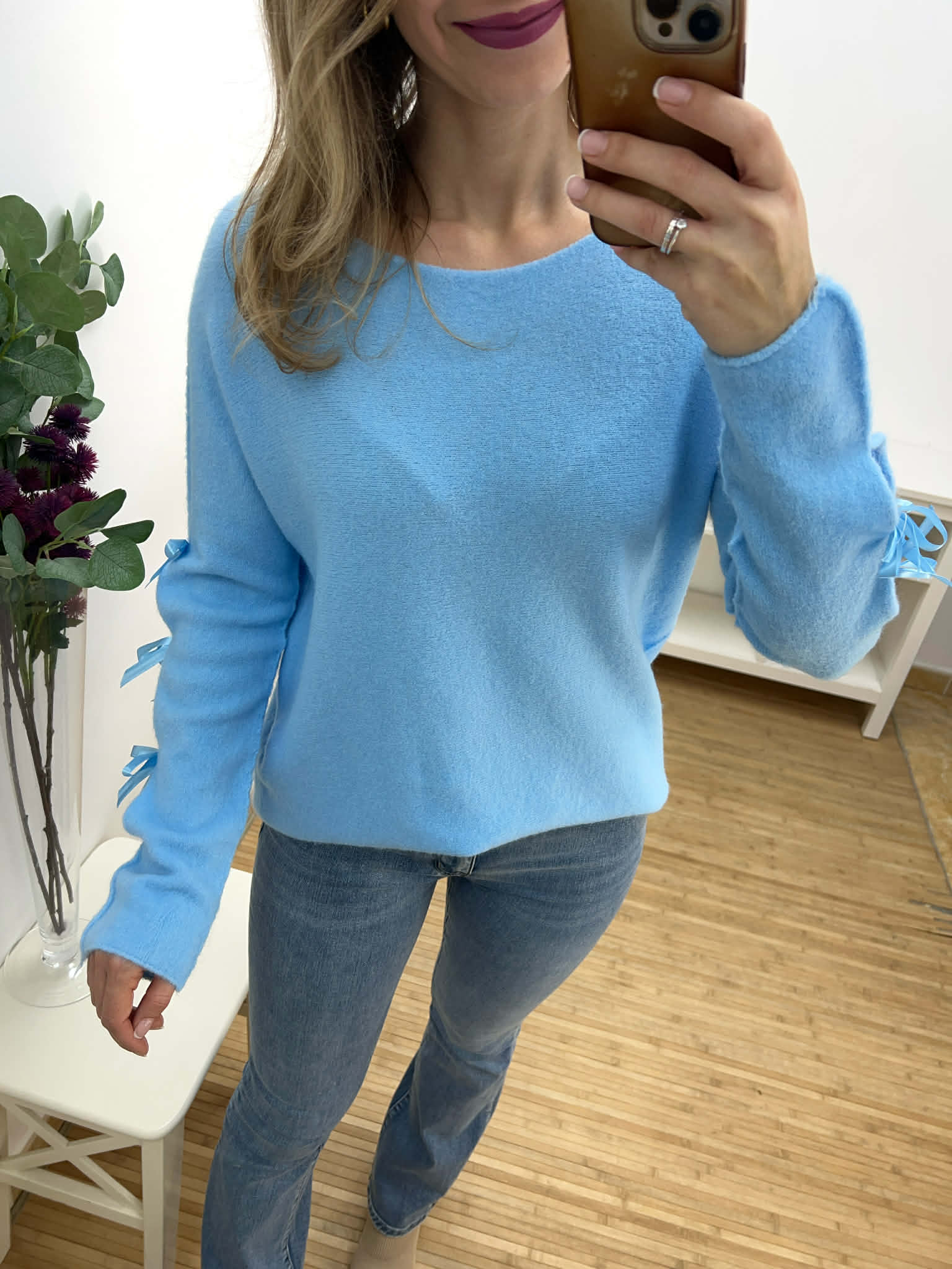 Jersey suave con cuello redondo y lazos en las mangas. Mangas con aberturas de moda entre lazos. Disponible: azul marino, celeste y beige.
