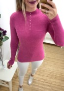 Jersey fucsia con cuello chimenea, tejido muy elástico y suave con tacto peluche . Tiene perlas decorativas en el cuello y detalle de lineas en el pecho.