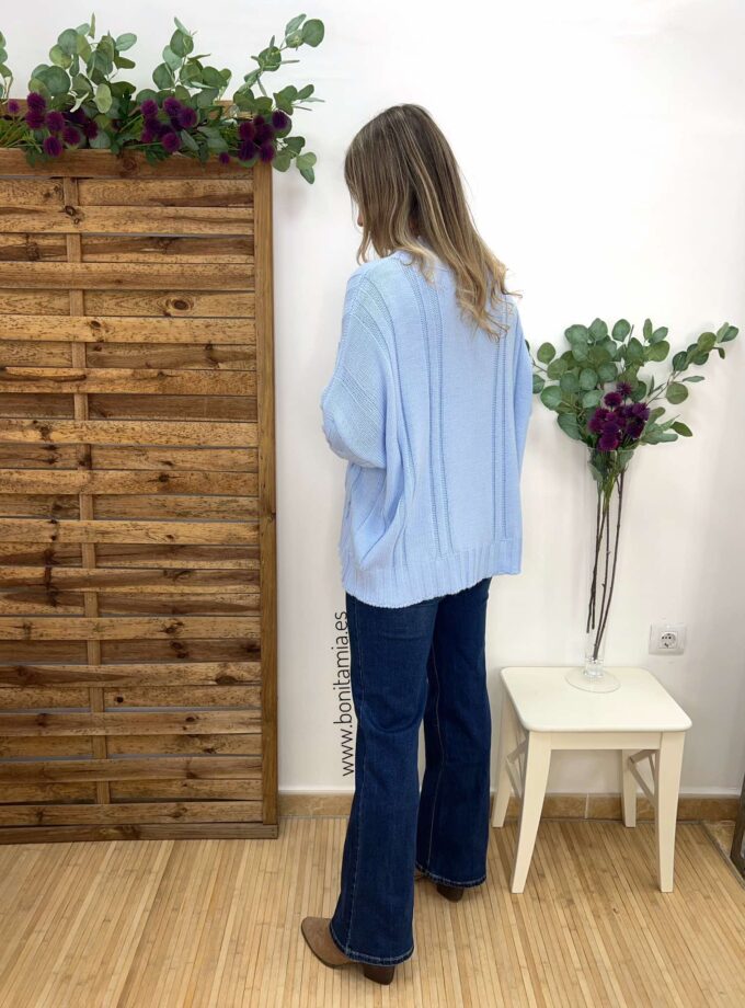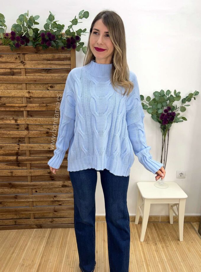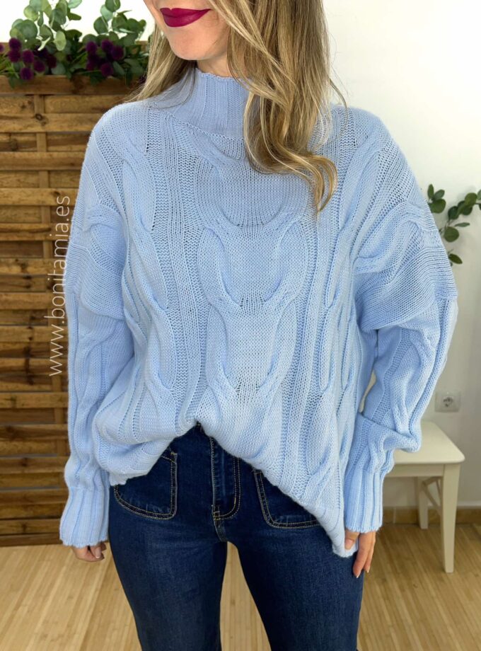 Jersey celeste con trezado y corte oversize. Cuello semi y puños ajustados. Perfecto para jeans, legging, shorts y botas…