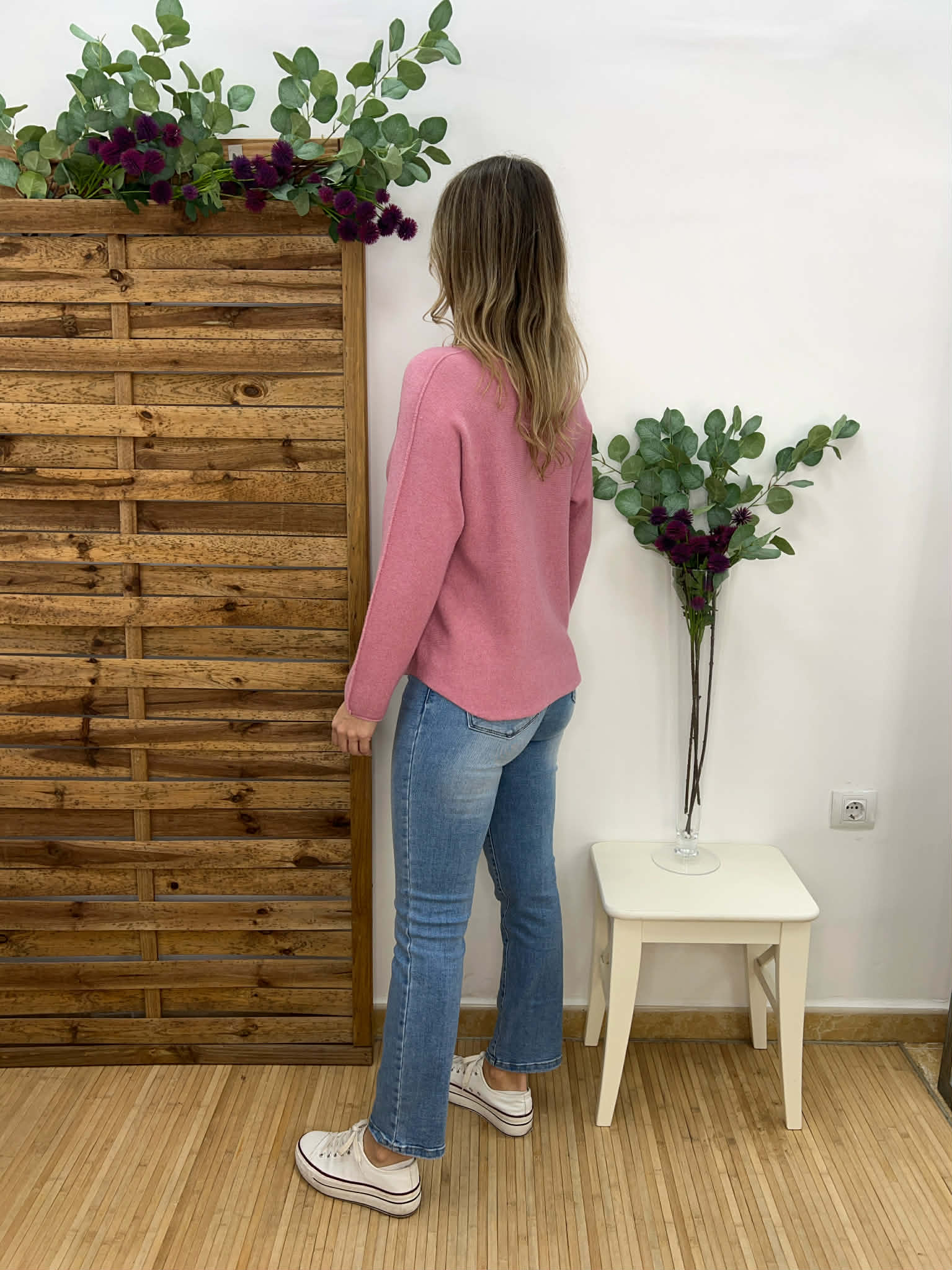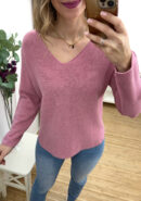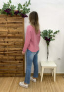 Jersey ancho de punto en color rosa con escote en pico y bajo redondeado.