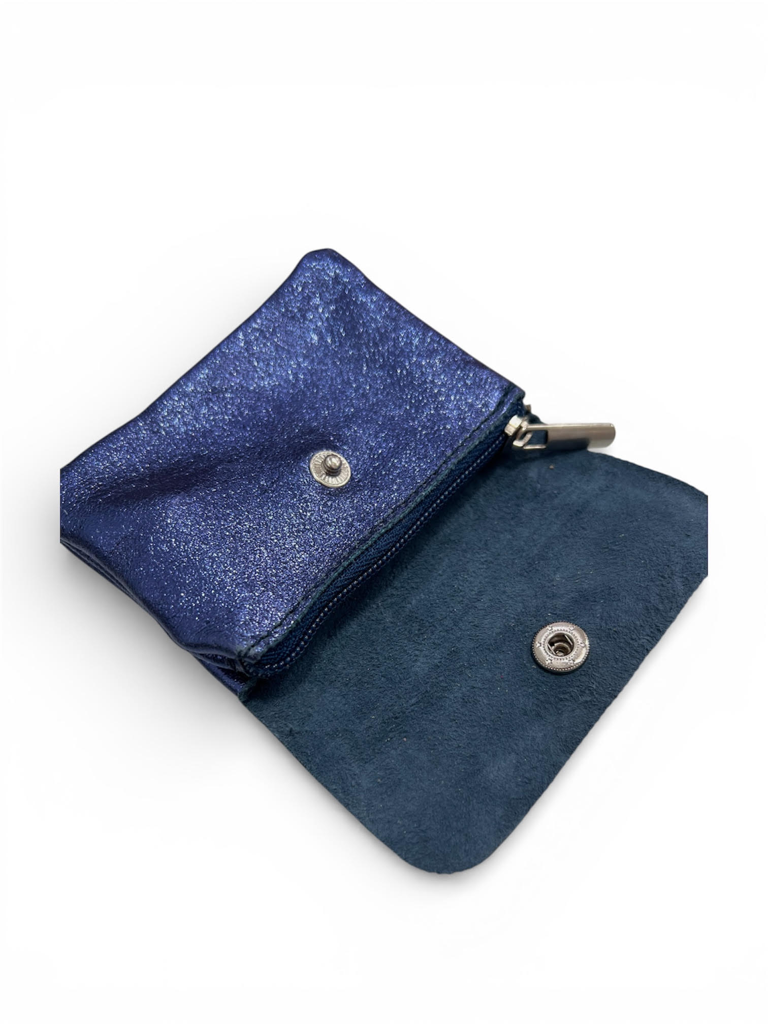 Monedero piel azul con cremallera y apartado para tarjetas.