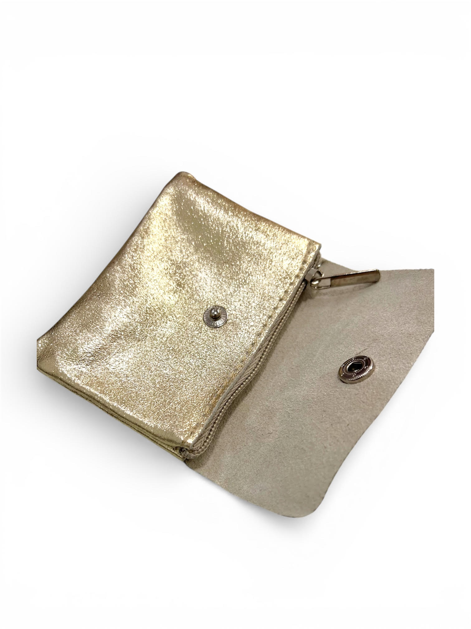 Monedero piel dorado con cremallera y apartado para tarjetas.
