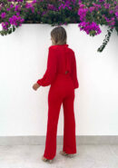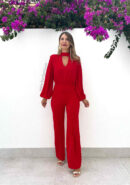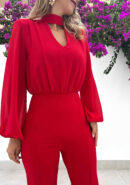 Mono rojo de gasa y crepé elástico. Tiene mangas abullonadas con goma y hombreras súper elegantes. Cuello halter con lazada trasera que cae sobre el escote de la espalda. Tiene cremallera invisible.