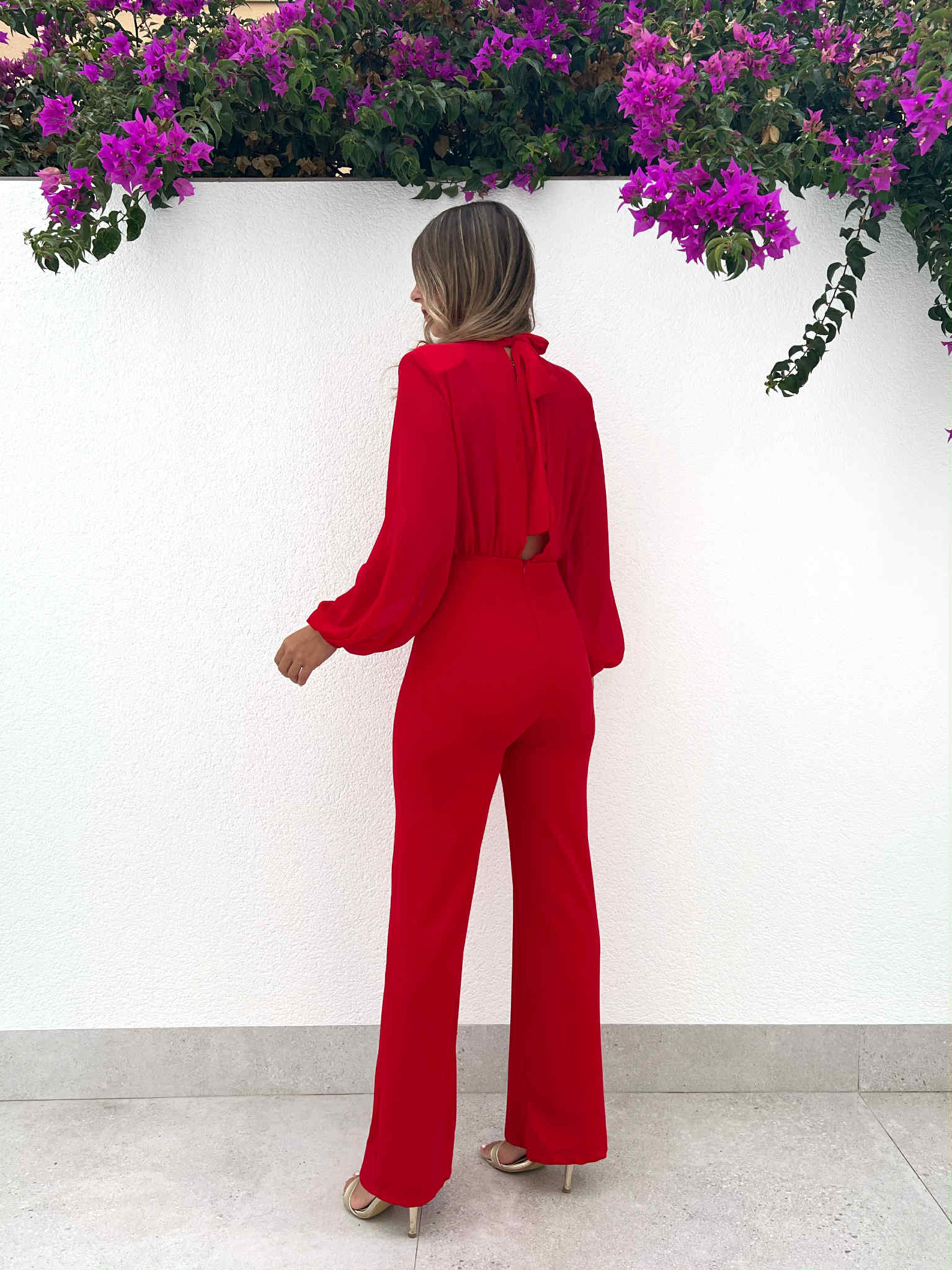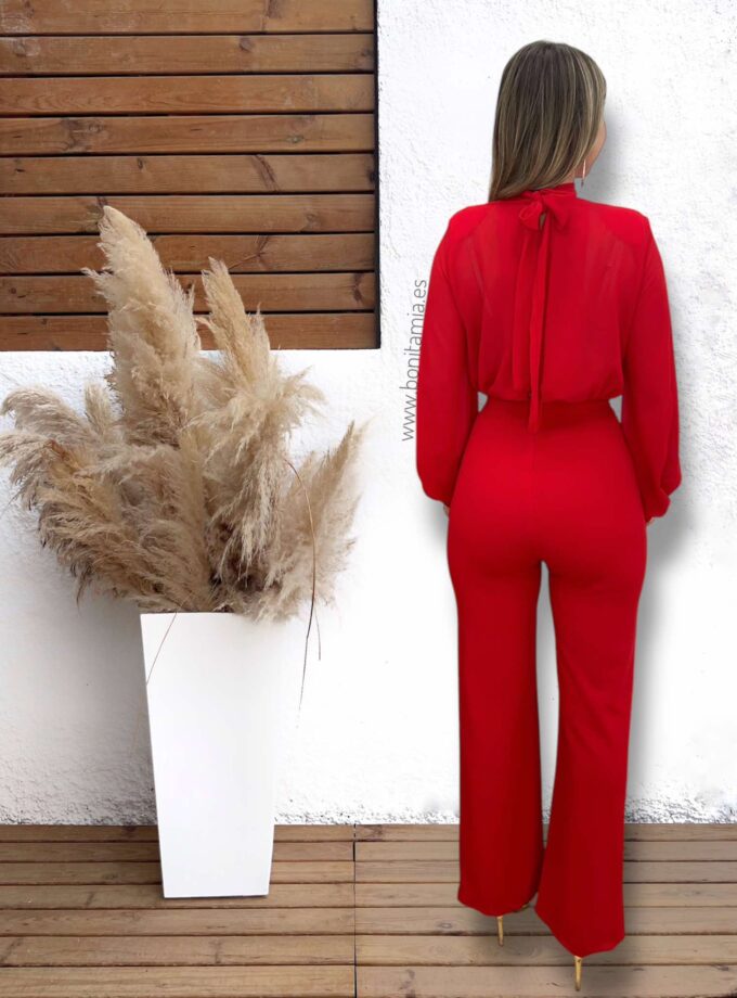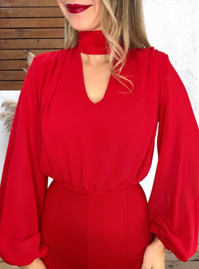 Mono rojo de gasa y crepé elástico. Tiene mangas abullonadas con goma y hombreras súper elegantes. Cuello halter con lazada trasera que cae sobre el escote de la espalda. Tiene cremallera invisible.