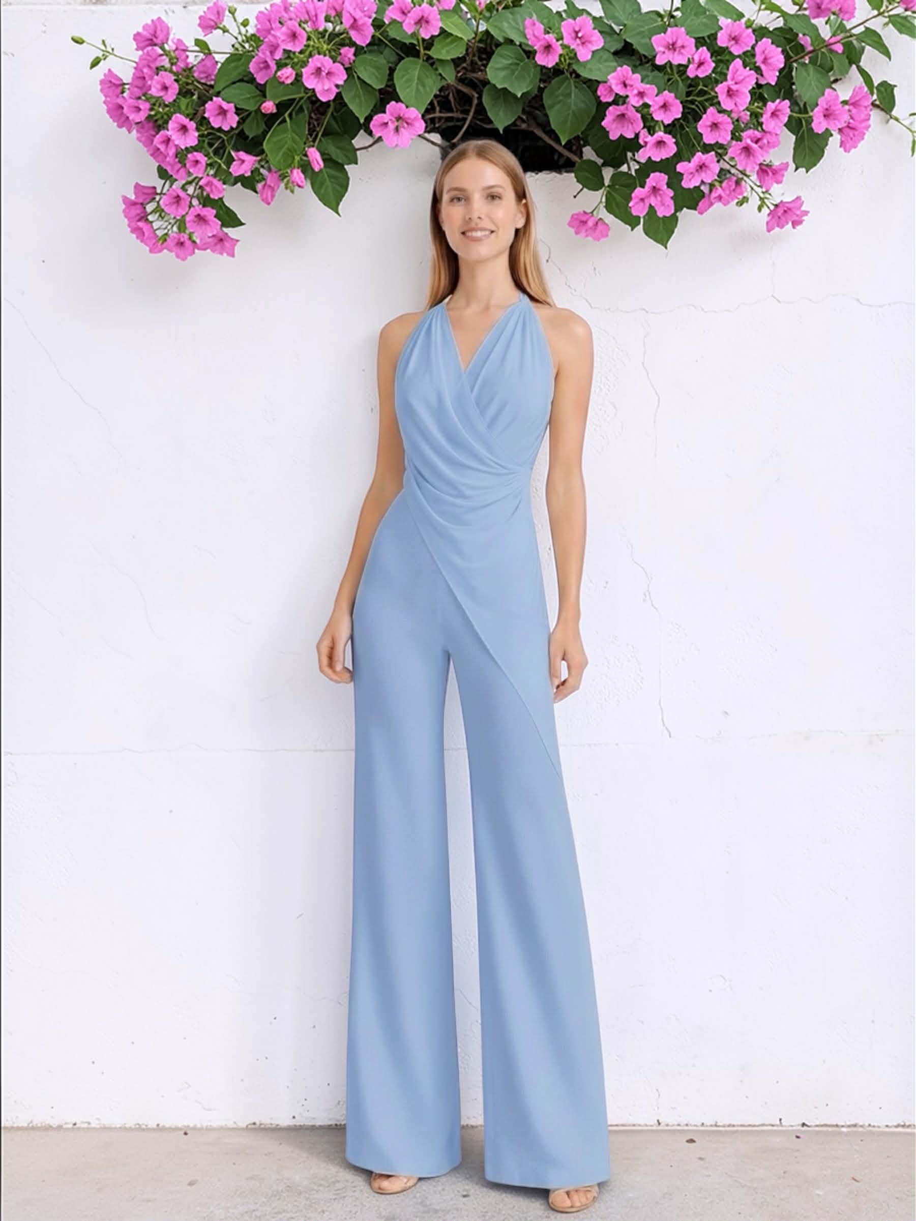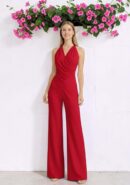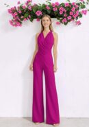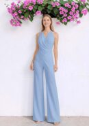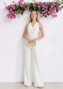 Mono abotonado al cuello de tejido crépe con textura y volante de gasa. Cremallera invisible trasera.