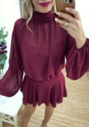 Mono corto de gasa burdeos efecto vestido con cuello halter y lazada atrás, volantes en bajo y nido de abeja atrás. Incluye forro interior.
