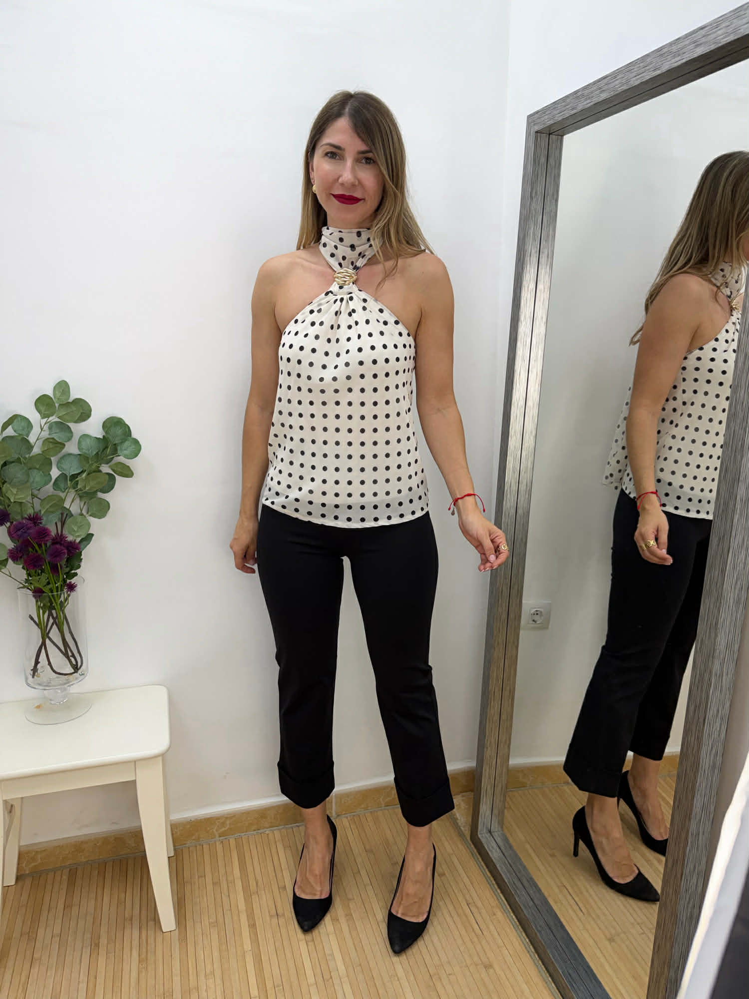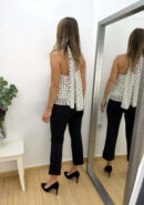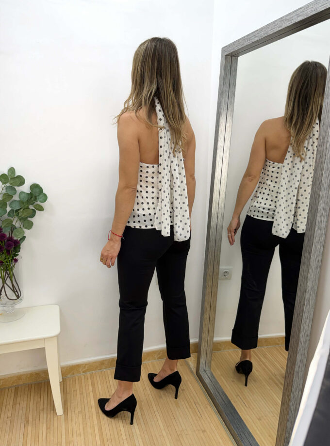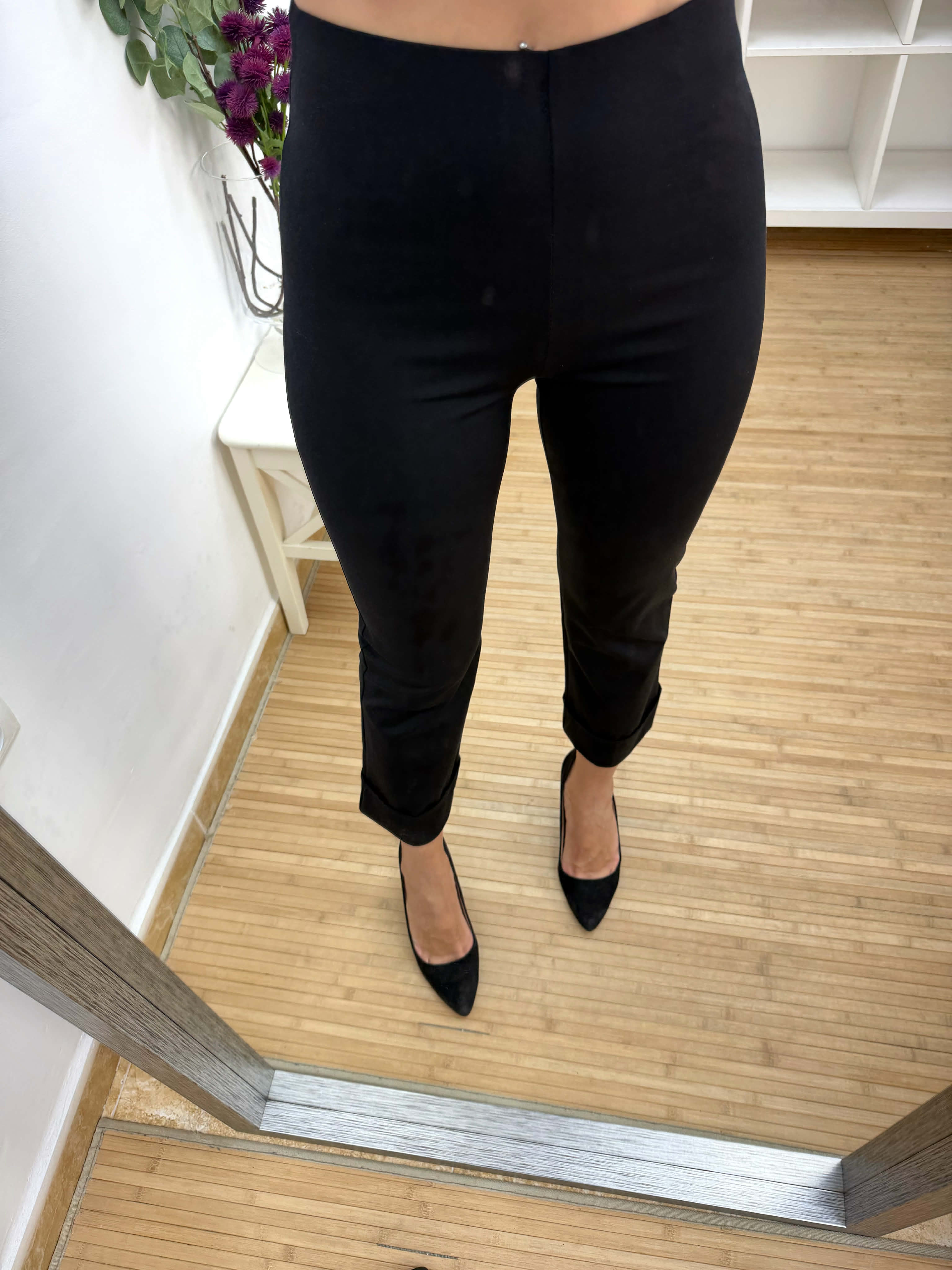 Pantalón negro elástico con efecto dobladillo en el bajo. Lleva goma invisible en la cintura.