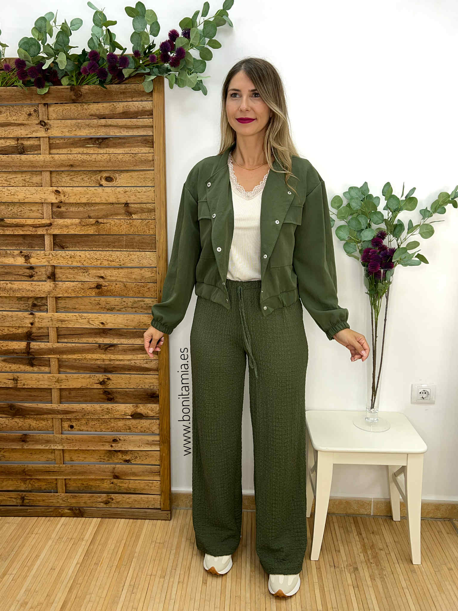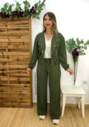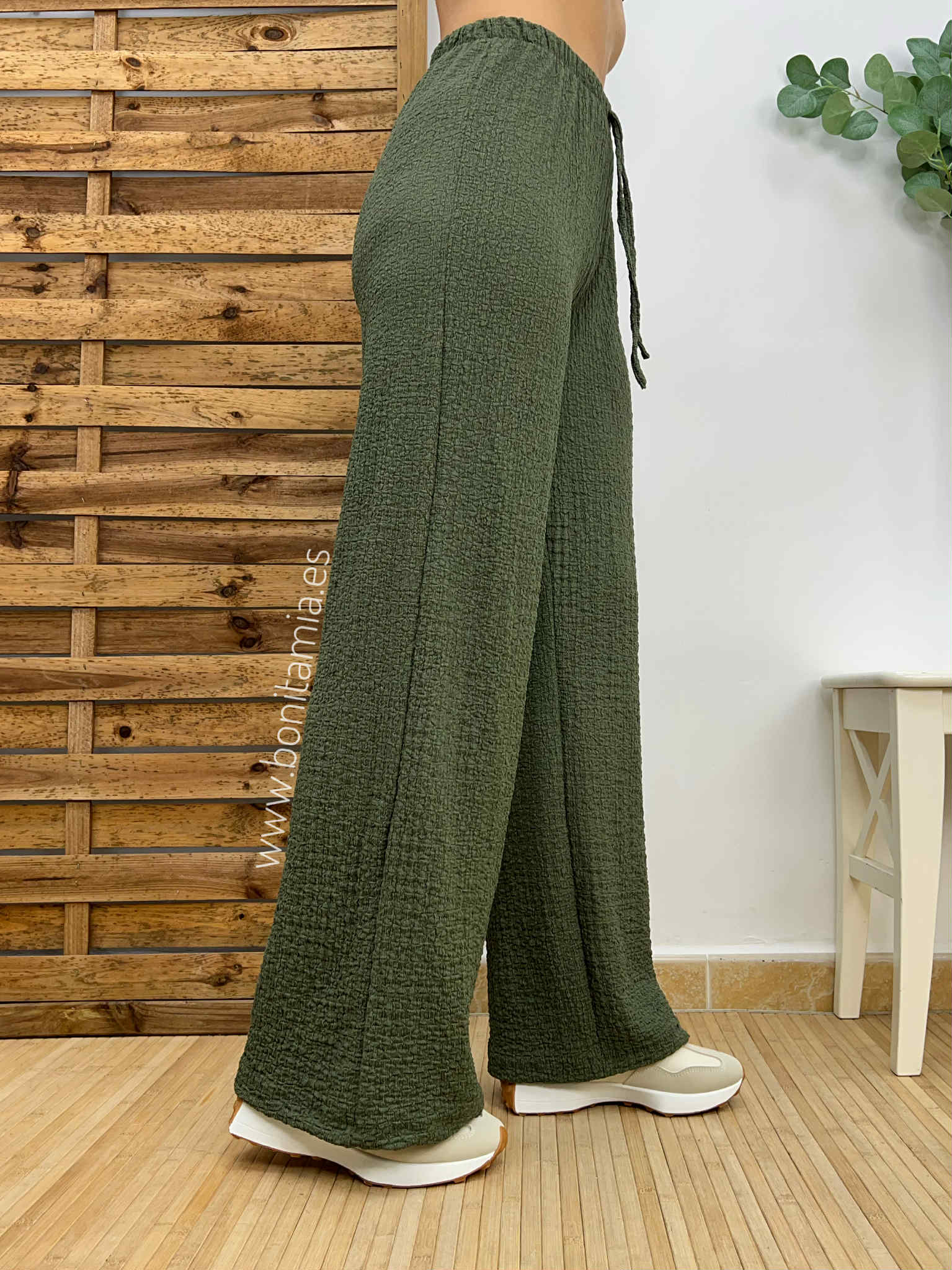 Pantalón fluido en color verde con goma en la cintura y lazada decorativa.