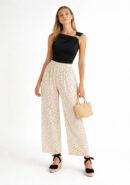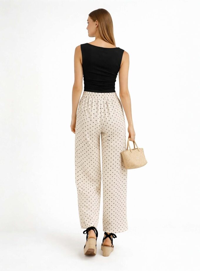 Pantalón fluido blanco con lunares negros, bolsillos laterales y goma en la cintura.
