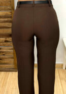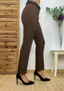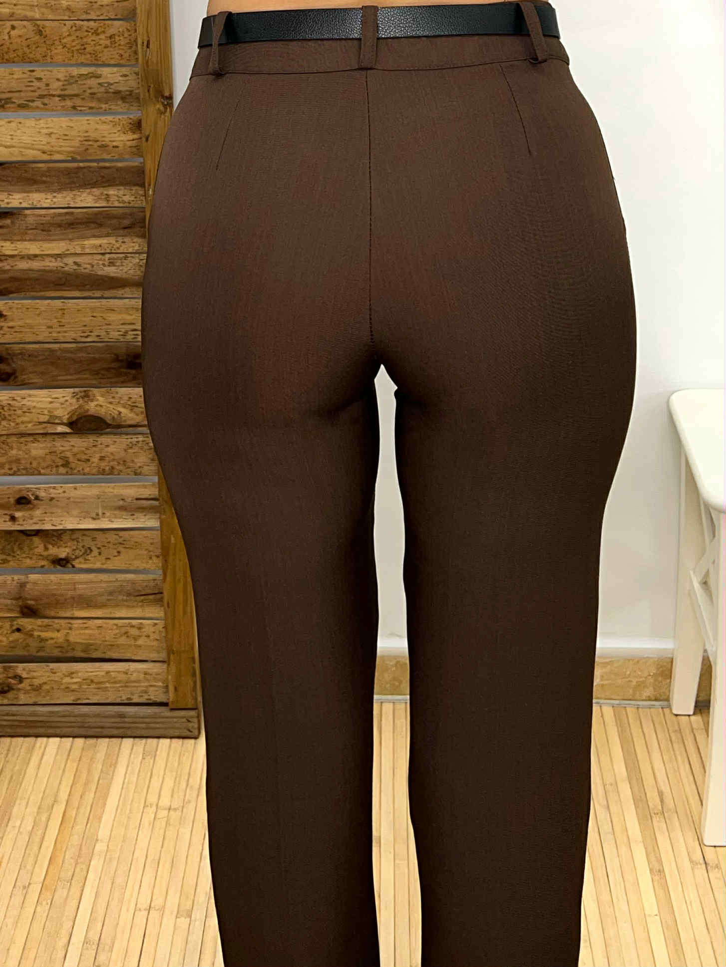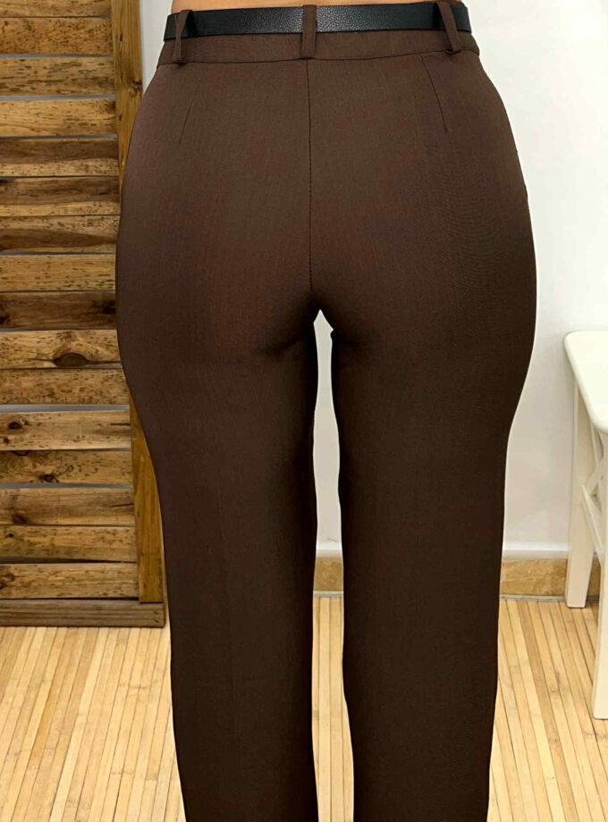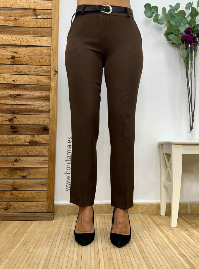 Pantalón de pinzas en color marrón chocolate con bolsillos en ambos laterales. Incluye cinturón de polipiel en color negro con hebilla dorada.