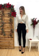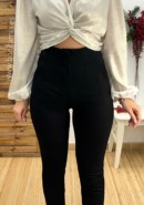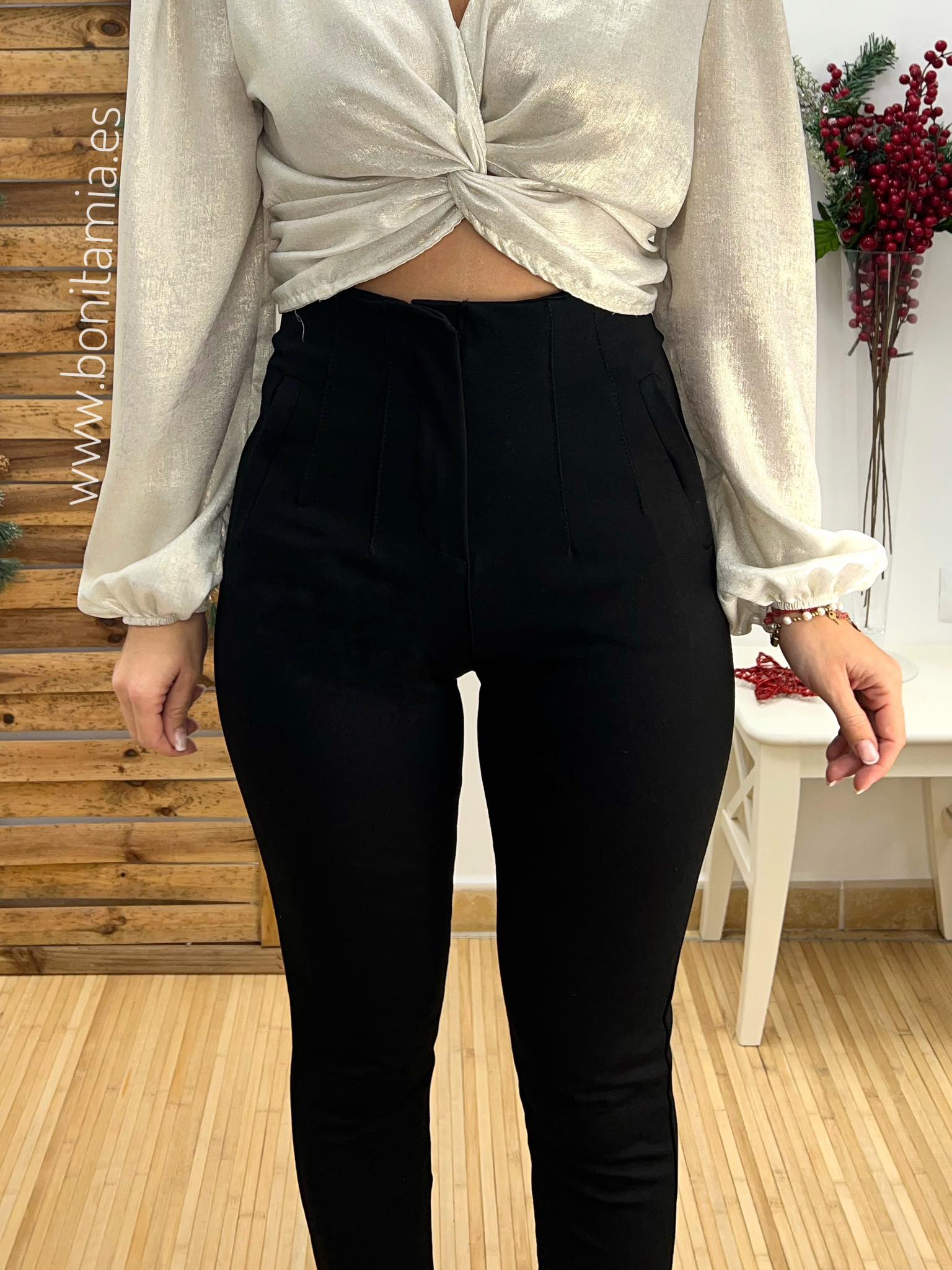 Pantalón de punto roma en color negro estilo pitillo con pinzas, bolsillos delanteros y cremallera delantera.