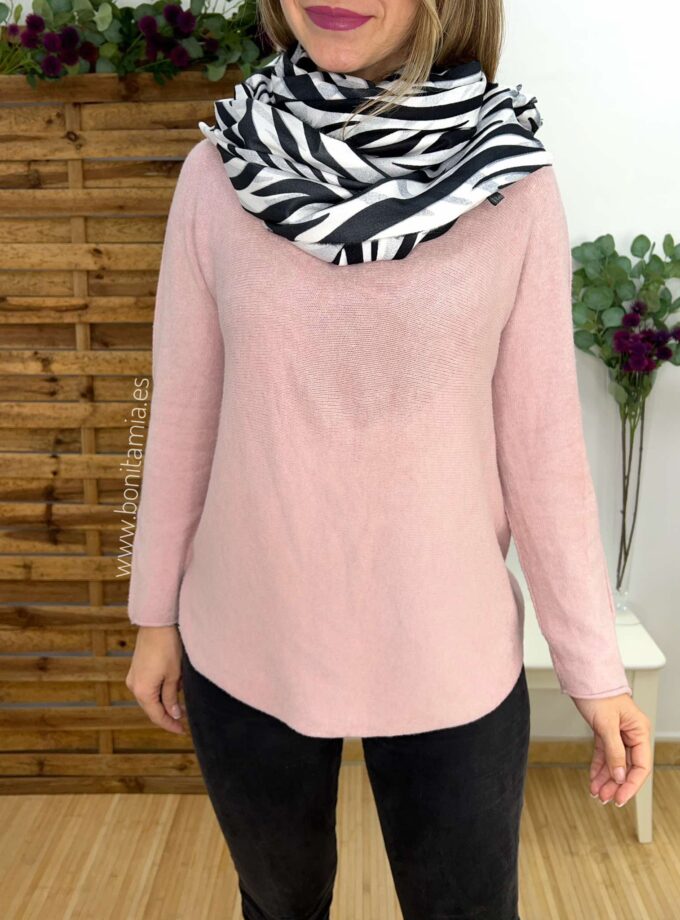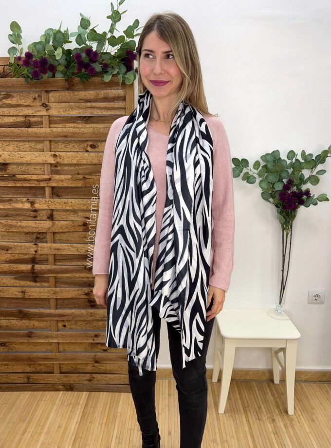 Pañuelo tipo bufanda en estampado cebra blanco y negro. Tejido denso y suave.