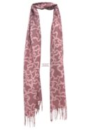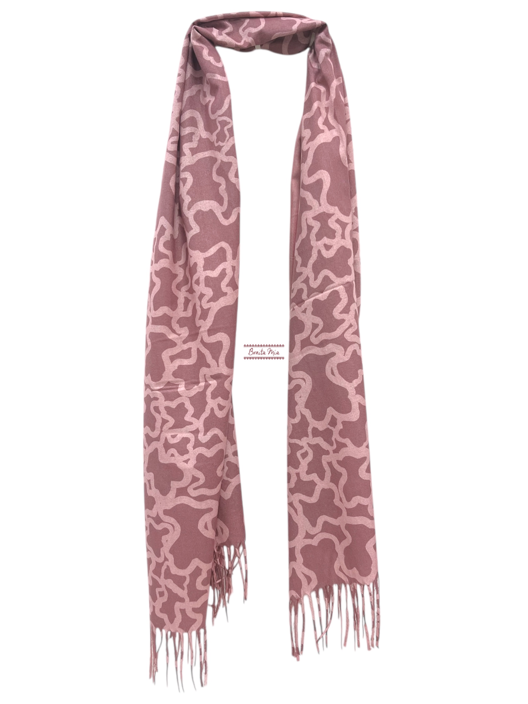Pañuelo tipo bufanda en tonos rosas y estampado de osos. Tacto suave y flecos en los extremos.